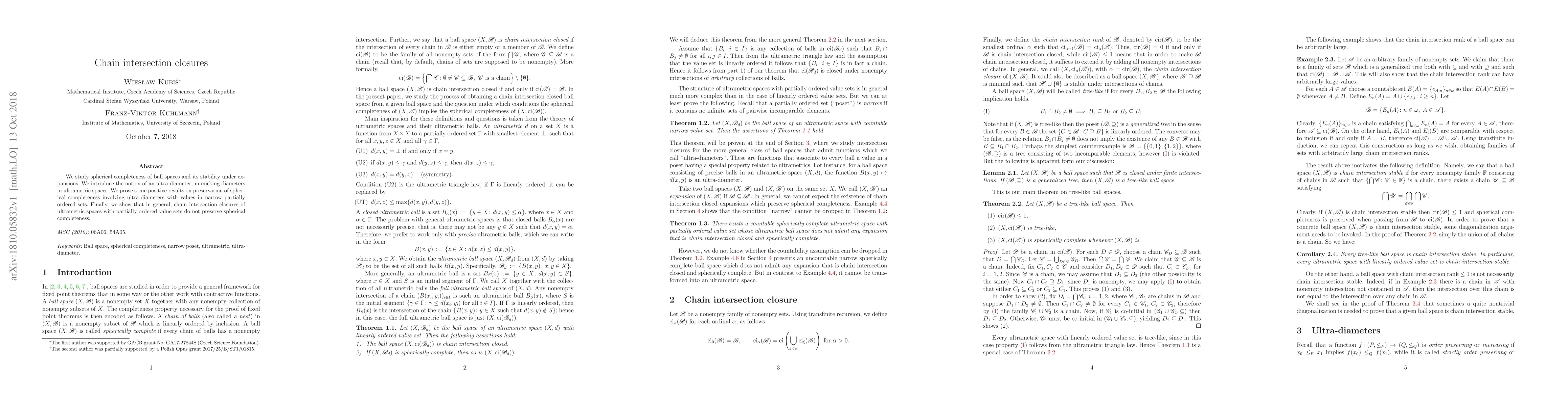 We study spherical completeness of ball spaces and its stability under expansions. We introduce the notion of an ultra-diameter, mimicking diameters in ultrametric spaces. We prove some positive results on preservation of spherical completeness involving ultra-diameters with values in narrow partially ordered sets. Finally, we show that in general, chain intersection closures of ultrametric spaces with partially ordered value sets do not preserve spherical completeness.