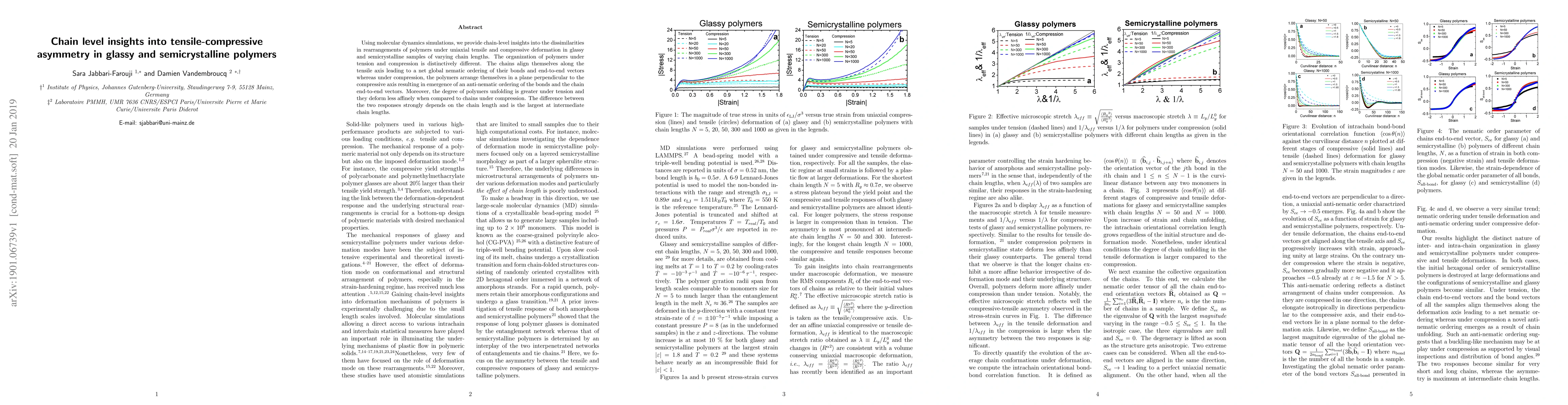 This study uses molecular dynamics simulations to reveal how glassy and semicrystalline polymers behave differently under tensile and compressive forces, showing distinct chain alignments and orderings. The research highlights that polymer chains exhibit greater unfolding and non-affine deformation under tension compared to compression, with the largest differences observed at intermediate chain lengths.