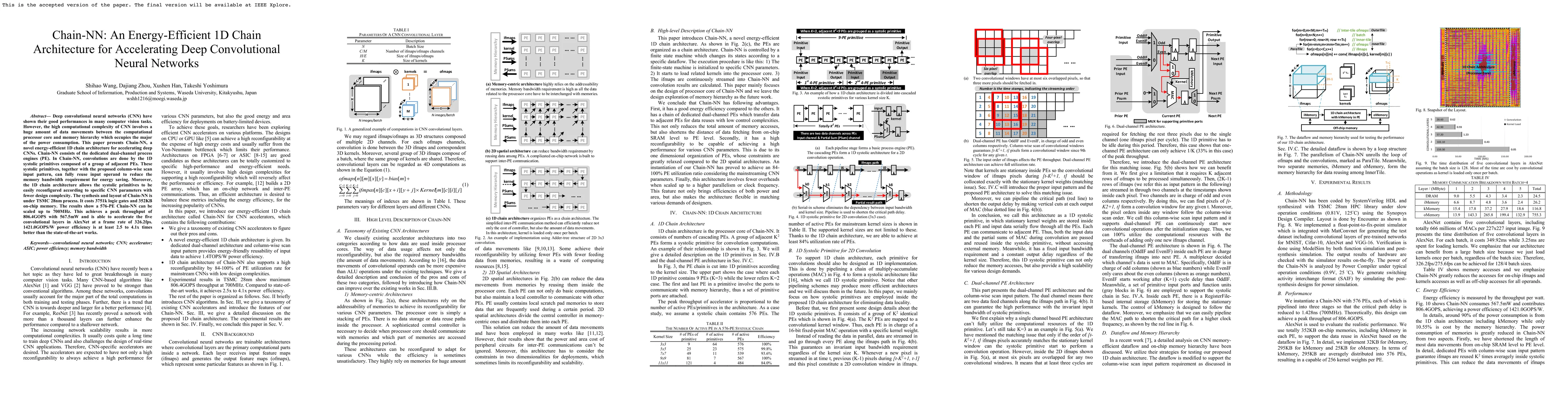 Chain-NN is an energy-efficient 1D chain architecture that accelerates deep convolutional neural networks by reducing data movements and increasing reusability of input operands. It achieves a peak throughput of 806.4GOPS with 567.5mW power efficiency, outperforming state-of-the-art works by at least 2.5 to 4.1x times.