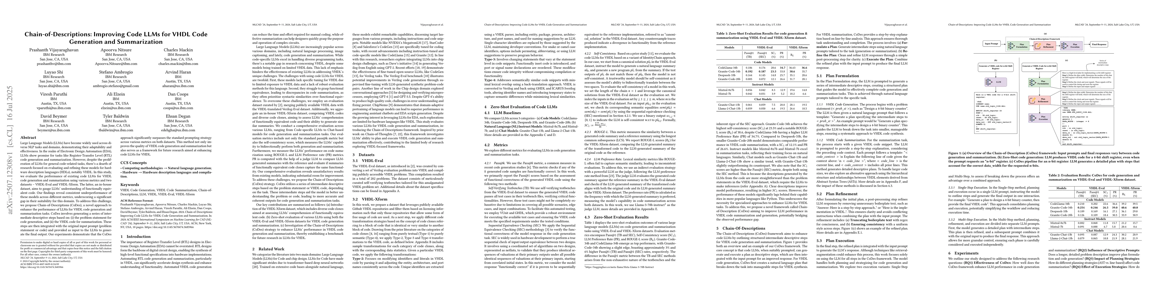 Large Language Models (LLMs) have become widely used across diverse NLP tasks and domains, demonstrating their adaptability and effectiveness. In the realm of Electronic Design Automation (EDA), LLMs show promise for tasks like Register-Transfer Level (RTL) code generation and summarization. However, despite the proliferation of LLMs for general code-related tasks, there's a dearth of research focused on evaluating and refining these models for hardware description languages (HDLs), notably VHDL. In this study, we evaluate the performance of existing code LLMs for VHDL code generation and summarization using various metrics and two datasets -- VHDL-Eval and VHDL-Xform. The latter, an in-house dataset, aims to gauge LLMs' understanding of functionally equivalent code. Our findings reveal consistent underperformance of these models across different metrics, underscoring a significant gap in their suitability for this domain. To address this challenge, we propose Chain-of-Descriptions (CoDes), a novel approach to enhance the performance of LLMs for VHDL code generation and summarization tasks. CoDes involves generating a series of intermediate descriptive steps based on: (i) the problem statement for code generation, and (ii) the VHDL code for summarization. These steps are then integrated with the original input prompt (problem statement or code) and provided as input to the LLMs to generate the final output. Our experiments demonstrate that the CoDes approach significantly surpasses the standard prompting strategy across various metrics on both datasets. This method not only improves the quality of VHDL code generation and summarization but also serves as a framework for future research aimed at enhancing code LLMs for VHDL.