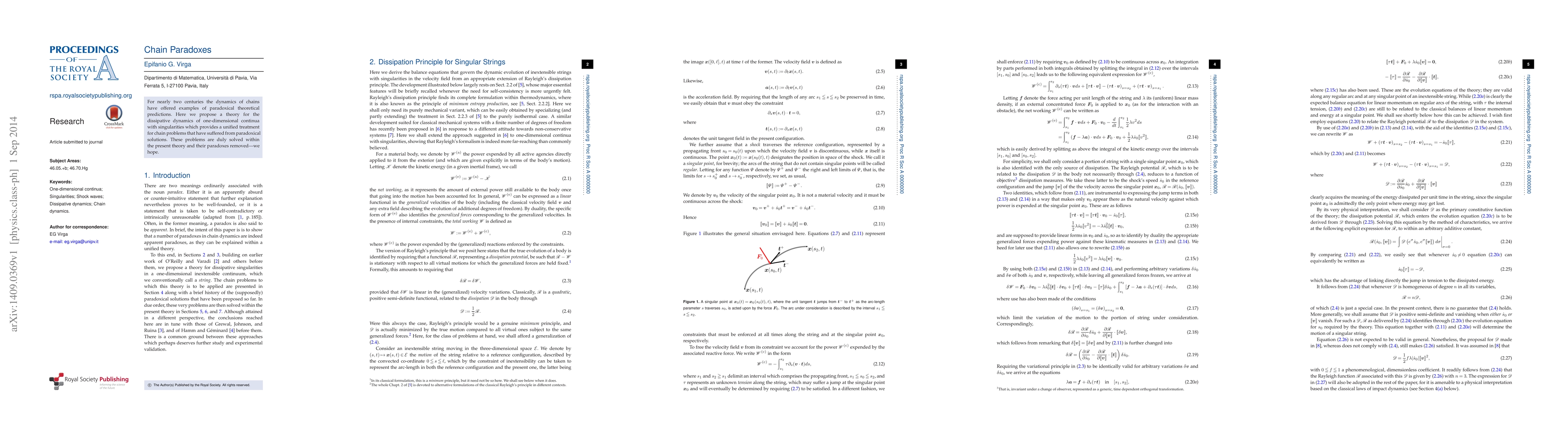 For nearly two centuries the dynamics of chains have offered examples of paradoxical theoretical predictions. Here we propose a theory for the dissipative dynamics of one-dimensional continua with singularities which provides a unified treatment for chain problems that have suffered from paradoxical solutions. These problems are duly solved within the present theory and their paradoxes removed---we hope.