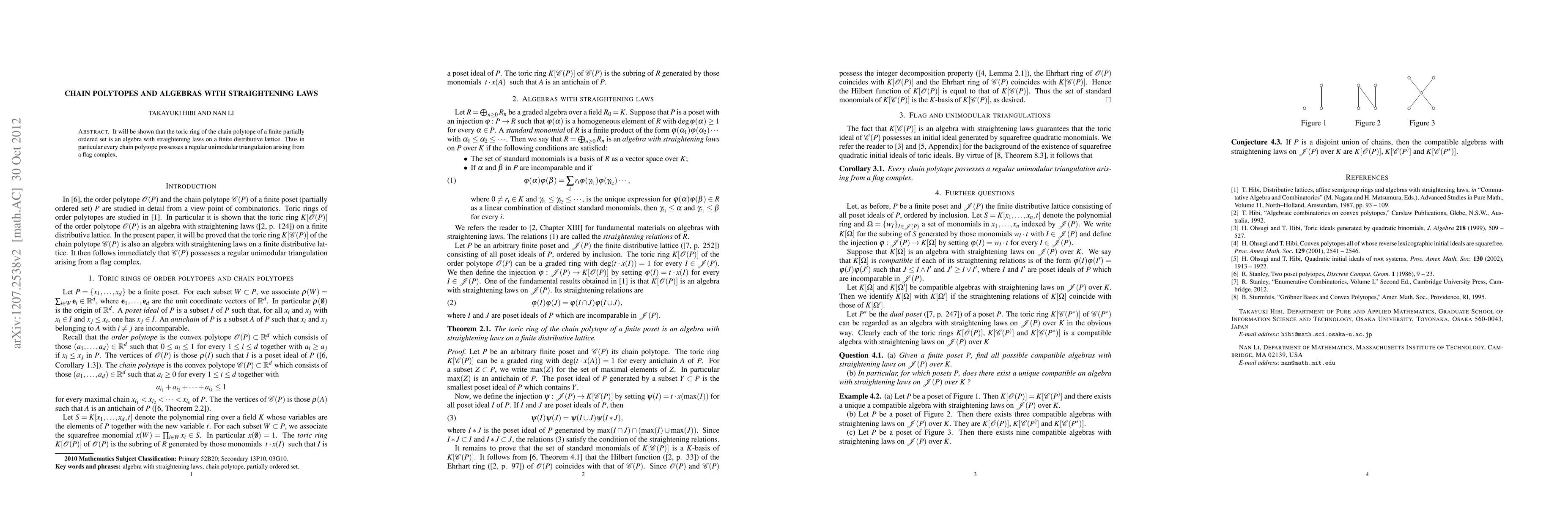 This research establishes that the toric ring of a chain polytope's associated finite partially ordered set forms an algebra with straightening laws on a finite distributive lattice. Consequently, every chain polytope is shown to have a regular unimodular triangulation derived from a flag complex.