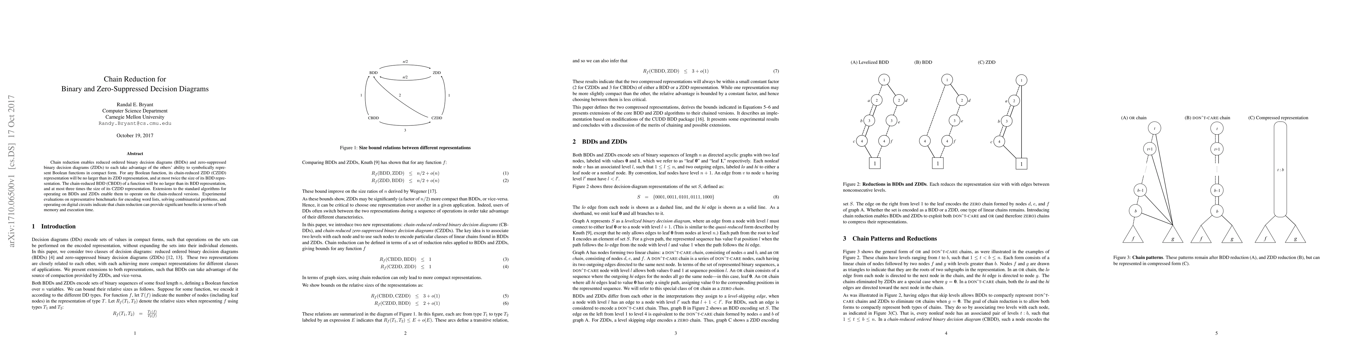 Chain reduction enables reduced ordered binary decision diagrams (BDDs) and zero-suppressed binary decision diagrams (ZDDs) to each take advantage of the others' ability to symbolically represent Boolean functions in compact form. For any Boolean function, its chain-reduced ZDD (CZDD) representation will be no larger than its ZDD representation, and at most twice the size of its BDD representation. The chain-reduced BDD (CBDD) of a function will be no larger than its BDD representation, and at most three times the size of its CZDD representation. Extensions to the standard algorithms for operating on BDDs and ZDDs enable them to operate on the chain-reduced versions. Experimental evaluations on representative benchmarks for encoding word lists, solving combinatorial problems, and operating on digital circuits indicate that chain reduction can provide significant benefits in terms of both memory and execution time.