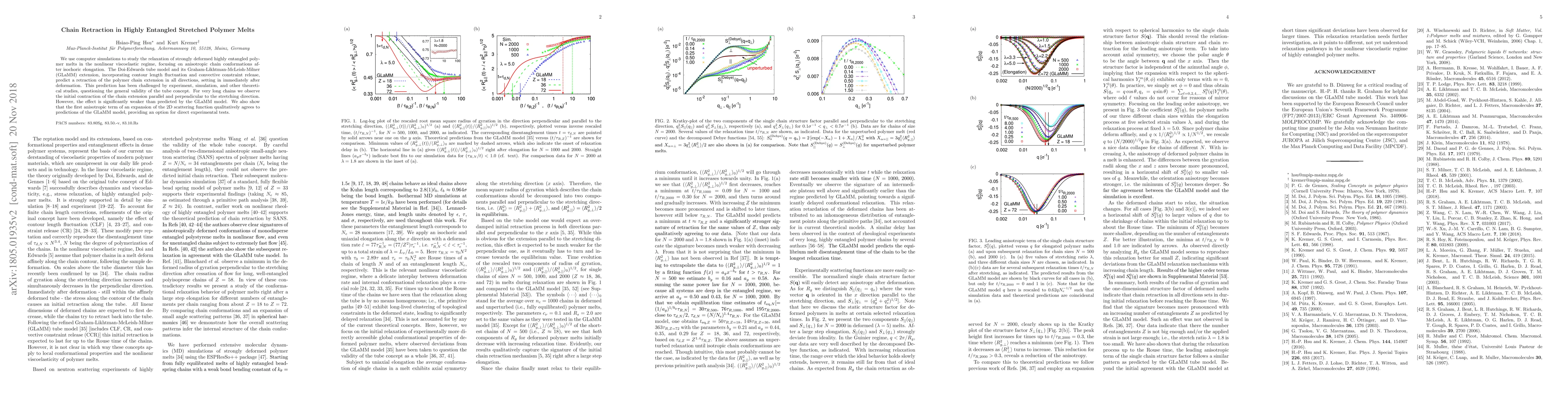 This paper uses computer simulations to investigate the relaxation behavior of highly entangled polymer melts after isochoric elongation, finding that chain retraction occurs but is weaker than predicted by the GLaMM model. The study also suggests that the first anisotropic term of the 2D scattering function aligns with GLaMM predictions, offering a potential experimental test.