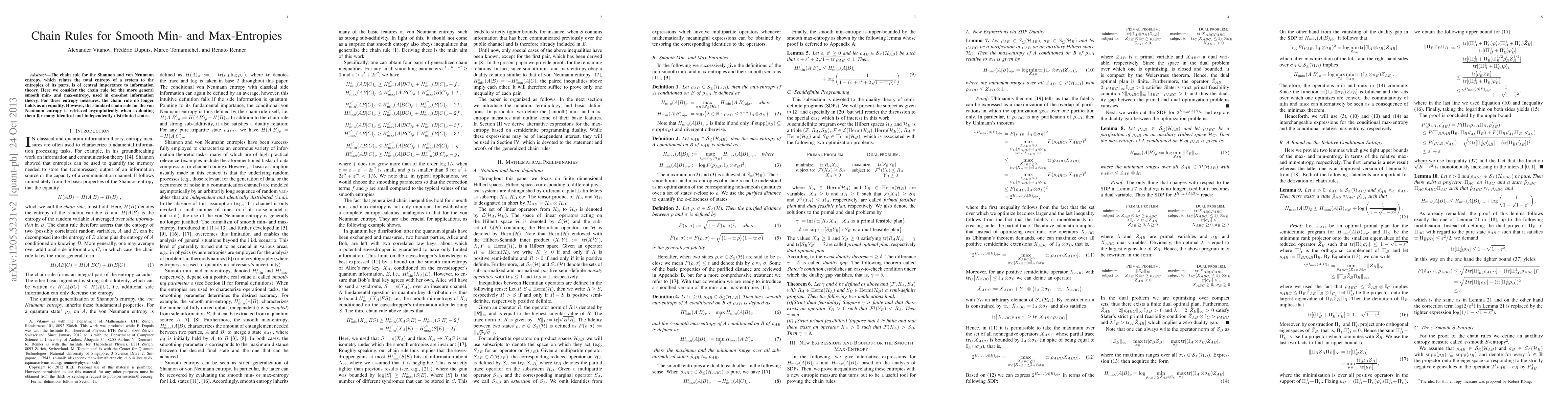 The chain rule for the Shannon and von Neumann entropy, which relates the total entropy of a system to the entropies of its parts, is of central importance to information theory. Here we consider the chain rule for the more general smooth min- and max-entropy, used in one-shot information theory. For these entropy measures, the chain rule no longer holds as an equality, but manifests itself as a set of inequalities that reduce to the chain rule for the von Neumann entropy in the i.i.d. case.
