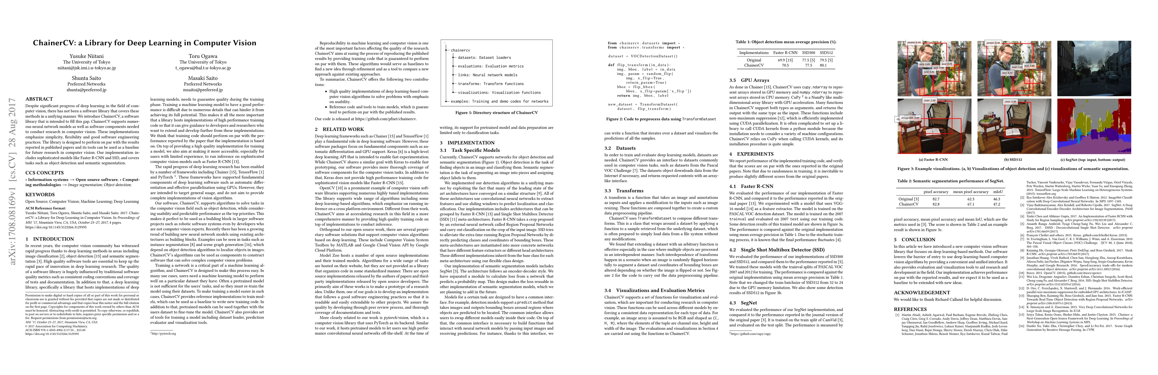 Despite significant progress of deep learning in the field of computer vision, there has not been a software library that covers these methods in a unifying manner. We introduce ChainerCV, a software library that is intended to fill this gap. ChainerCV supports numerous neural network models as well as software components needed to conduct research in computer vision. These implementations emphasize simplicity, flexibility and good software engineering practices. The library is designed to perform on par with the results reported in published papers and its tools can be used as a baseline for future research in computer vision. Our implementation includes sophisticated models like Faster R-CNN and SSD, and covers tasks such as object detection and semantic segmentation.