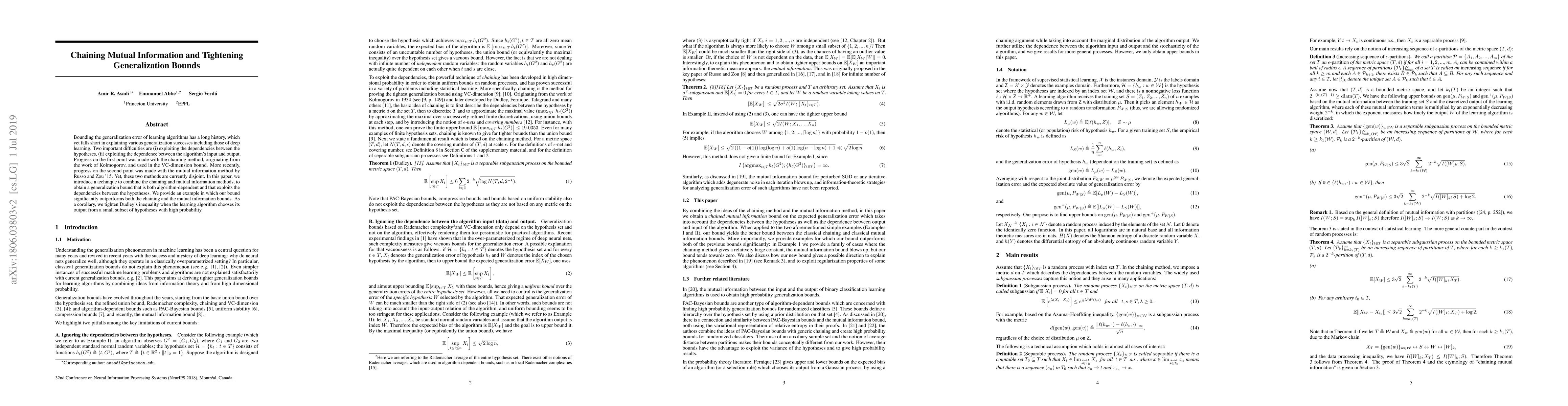 Bounding the generalization error of learning algorithms has a long history, which yet falls short in explaining various generalization successes including those of deep learning. Two important difficulties are (i) exploiting the dependencies between the hypotheses, (ii) exploiting the dependence between the algorithm's input and output. Progress on the first point was made with the chaining method, originating from the work of Kolmogorov, and used in the VC-dimension bound. More recently, progress on the second point was made with the mutual information method by Russo and Zou '15. Yet, these two methods are currently disjoint. In this paper, we introduce a technique to combine the chaining and mutual information methods, to obtain a generalization bound that is both algorithm-dependent and that exploits the dependencies between the hypotheses. We provide an example in which our bound significantly outperforms both the chaining and the mutual information bounds. As a corollary, we tighten Dudley's inequality when the learning algorithm chooses its output from a small subset of hypotheses with high probability.