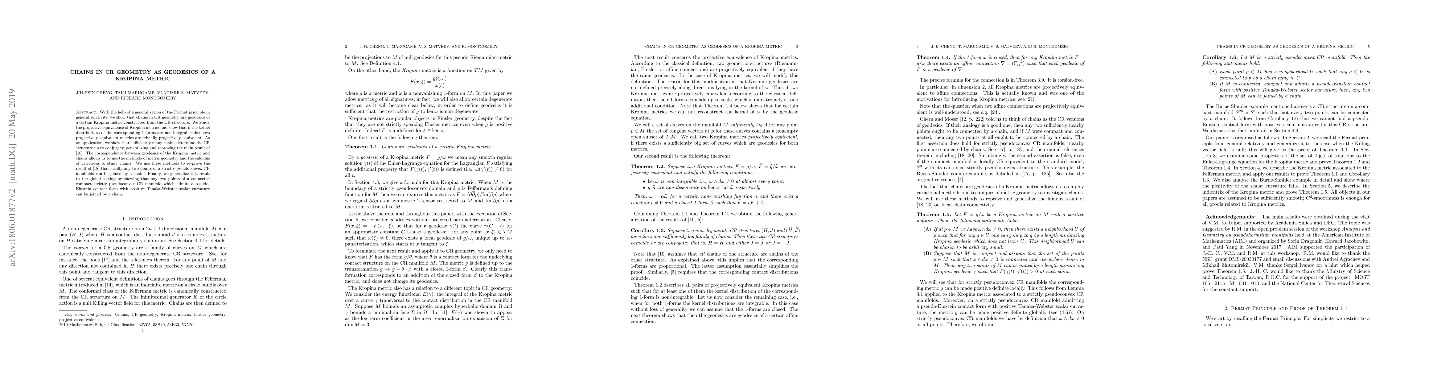 With the help of a generalization of the Fermat principle in general relativity, we show that chains in CR geometry are geodesics of a certain Kropina metric constructed from the CR structure. We study the projective equivalence of Kropina metrics and show that if the kernel distributions of the corresponding 1-forms are non-integrable then two projectively equivalent metrics are trivially projectively equivalent. As an application, we show that sufficiently many chains determine the CR structure up to conjugacy, generalizing and reproving the main result of [J.-H. Cheng, 1988]. The correspondence between geodesics of the Kropina metric and chains allows us to use the methods of metric geometry and the calculus of variations to study chains. We use these methods to re-prove the result of [H. Jacobowitz, 1985] that locally any two points of a strictly pseudoconvex CR manifolds can be joined by a chain. Finally, we generalize this result to the global setting by showing that any two points of a connected compact strictly pseudoconvex CR manifold which admits a pseudo-Einstein contact form with positive Tanaka-Webster scalar curvature can be joined by a chain.