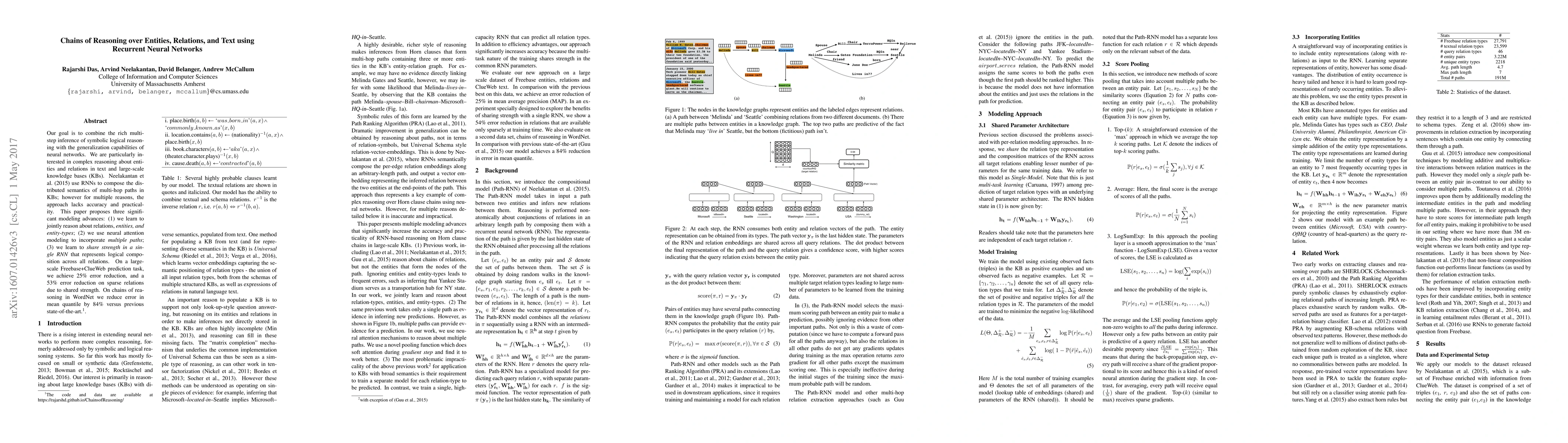This paper proposes advanced recurrent neural network (RNN) models to enhance logical reasoning over entities, relations, and text, achieving significant error reductions on large-scale knowledge base tasks and WordNet. The key improvements include joint reasoning about entities and relations, neural attention for multiple paths, and shared strength in a single RNN.