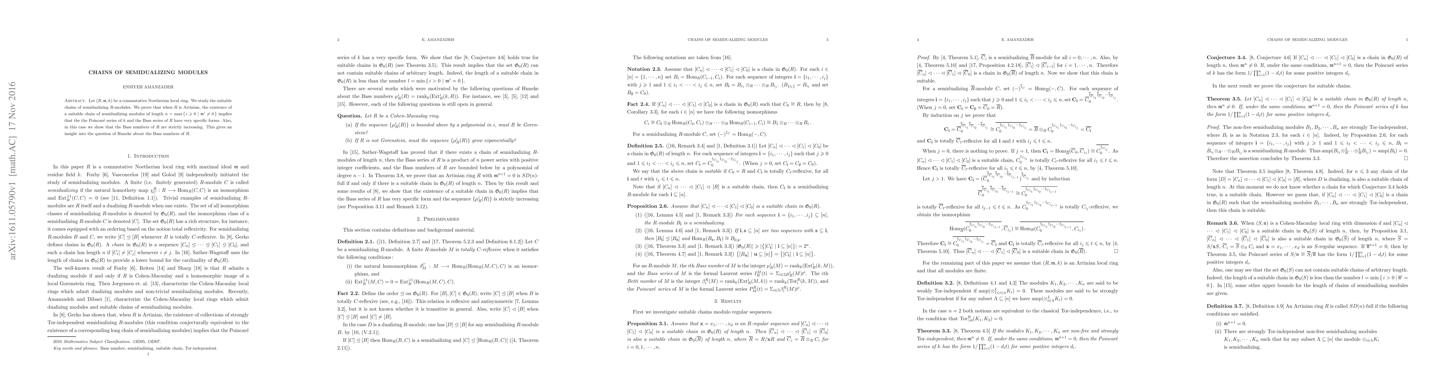 This paper investigates suitable chains of semidualizing $R$-modules in commutative Noetherian local Artinian rings, demonstrating that the existence of such chains of maximal length implies specific forms for the Poincaré series and Bass series, and shows that the Bass numbers of $R$ are strictly increasing.