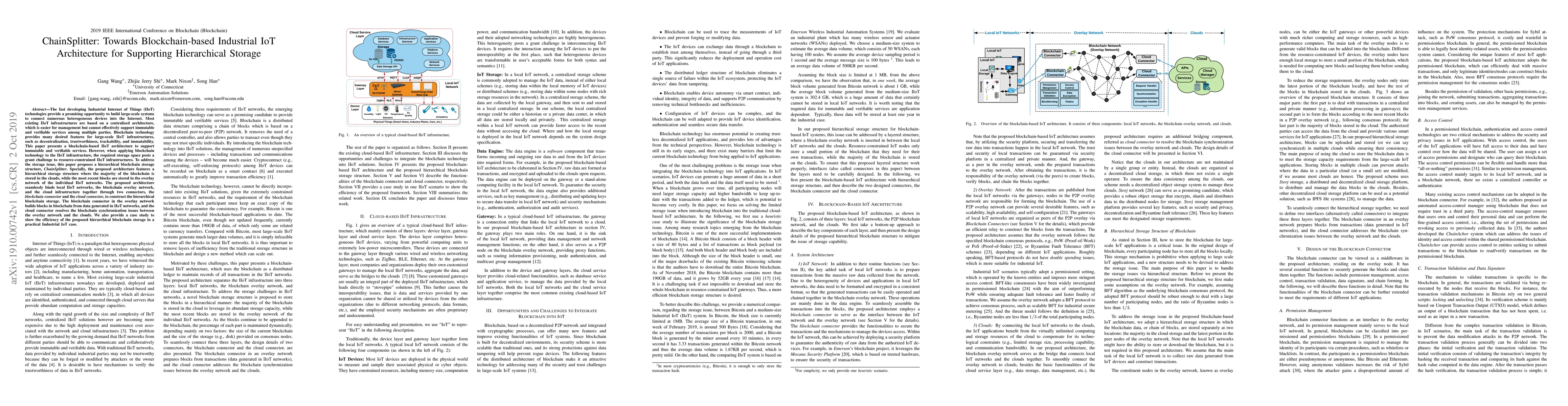 This paper introduces ChainSplitter, a blockchain-based architecture for Industrial IoT (IIoT) that leverages hierarchical storage to address storage challenges. It combines cloud storage for most of the blockchain with local storage for recent blocks, using blockchain and cloud connectors to synchronize data and ensure immutable and verifiable services.