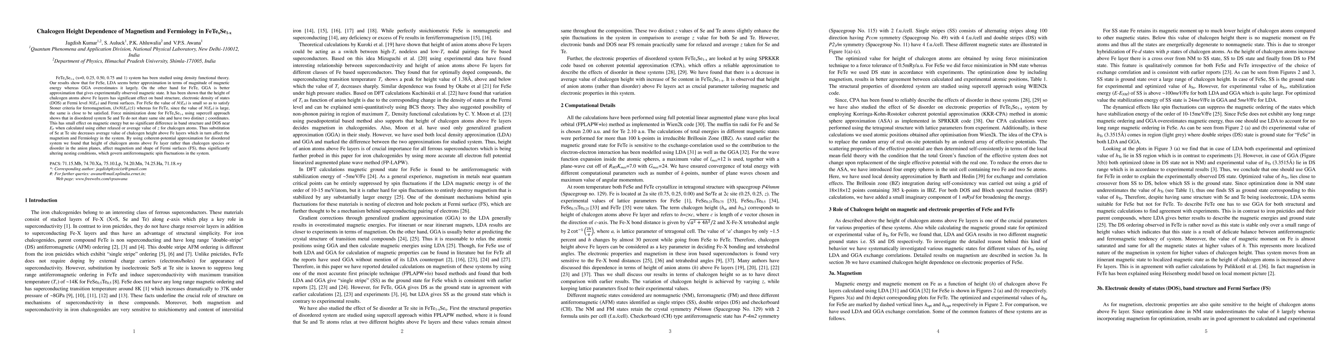 Research on FeTexSe1-x system shows that chalcogen height affects magnetism and Fermiology, with GGA being a better approximation for FeTe, while LDA is better for FeSe. The study highlights the significant impact of chalcogen height on band structure and magnetic energy.