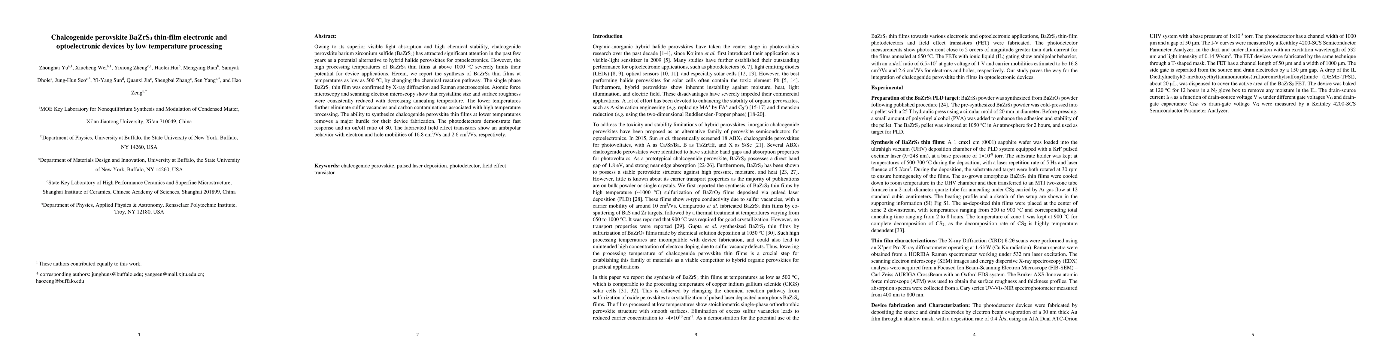 This paper presents the synthesis of BaZrS3 thin films via a low-temperature process, overcoming the high-temperature limitations of traditional methods. Devices made from these films show promising electronic and optoelectronic properties, including fast response photodetectors and ambipolar field effect transistors.