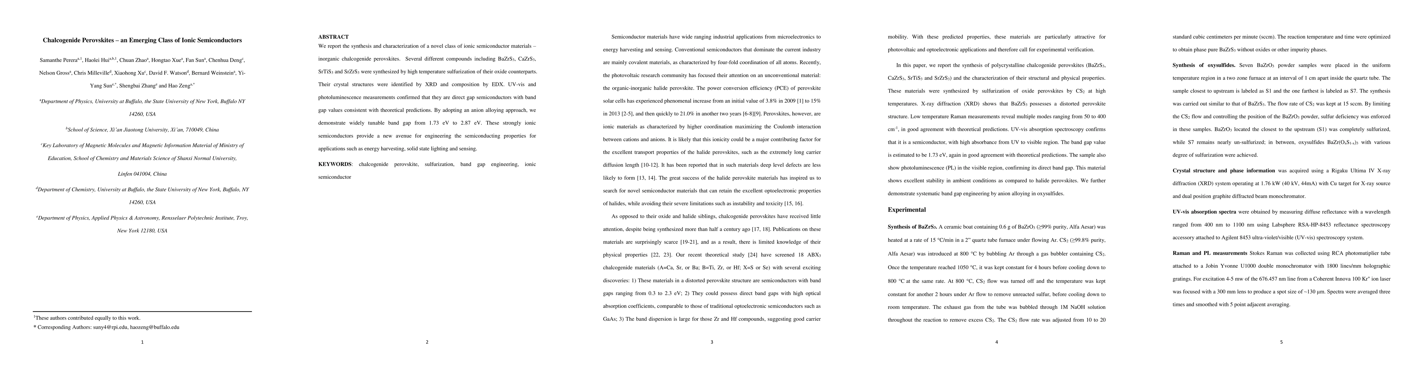 This paper synthesizes and characterizes novel inorganic chalcogenide perovskites, including BaZrS3, CaZrS3, SrTiS3, and SrZrS3, showing they are direct gap semiconductors with tunable band gaps from 1.73 eV to 2.87 eV, opening new possibilities for energy harvesting and sensing applications.