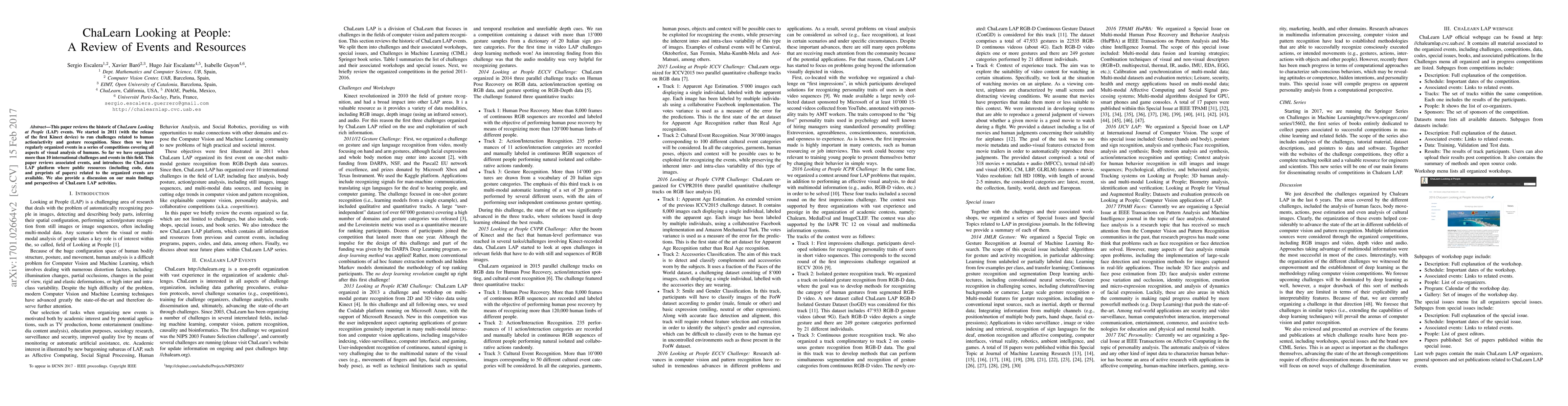 This paper reviews the history of ChaLearn Looking at People (LAP) events, which have organized over 10 international challenges on human action and gesture recognition since 2011. The platform provides public resources, including code, data, and papers, to support research in visual analysis of humans.