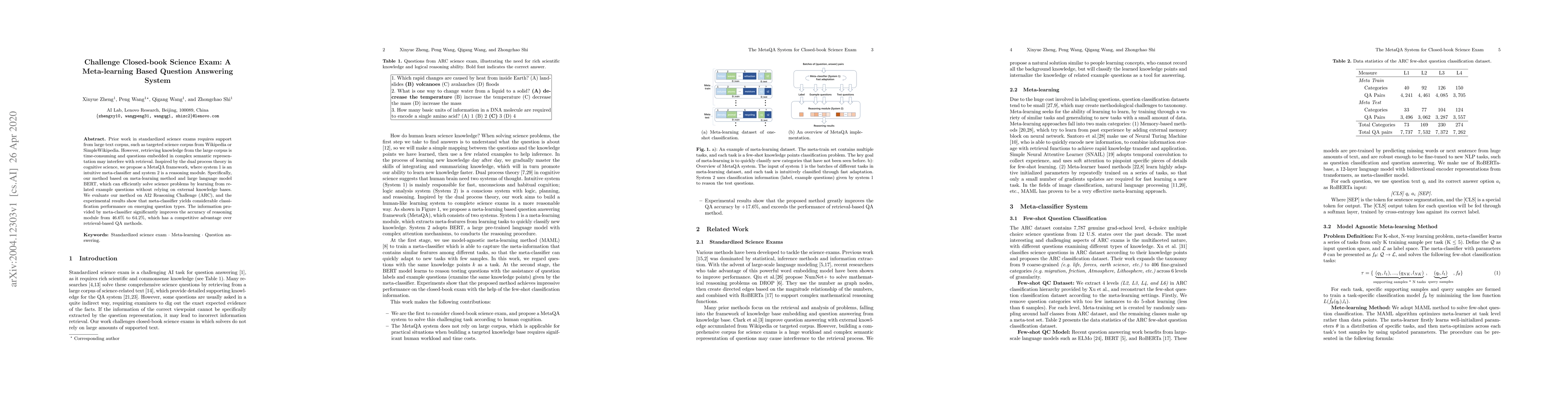 Prior work in standardized science exams requires support from large text corpus, such as targeted science corpus fromWikipedia or SimpleWikipedia. However, retrieving knowledge from the large corpus is time-consuming and questions embedded in complex semantic representation may interfere with retrieval. Inspired by the dual process theory in cognitive science, we propose a MetaQA framework, where system 1 is an intuitive meta-classifier and system 2 is a reasoning module. Specifically, our method based on meta-learning method and large language model BERT, which can efficiently solve science problems by learning from related example questions without relying on external knowledge bases. We evaluate our method on AI2 Reasoning Challenge (ARC), and the experimental results show that meta-classifier yields considerable classification performance on emerging question types. The information provided by meta-classifier significantly improves the accuracy of reasoning module from 46.6% to 64.2%, which has a competitive advantage over retrieval-based QA methods.