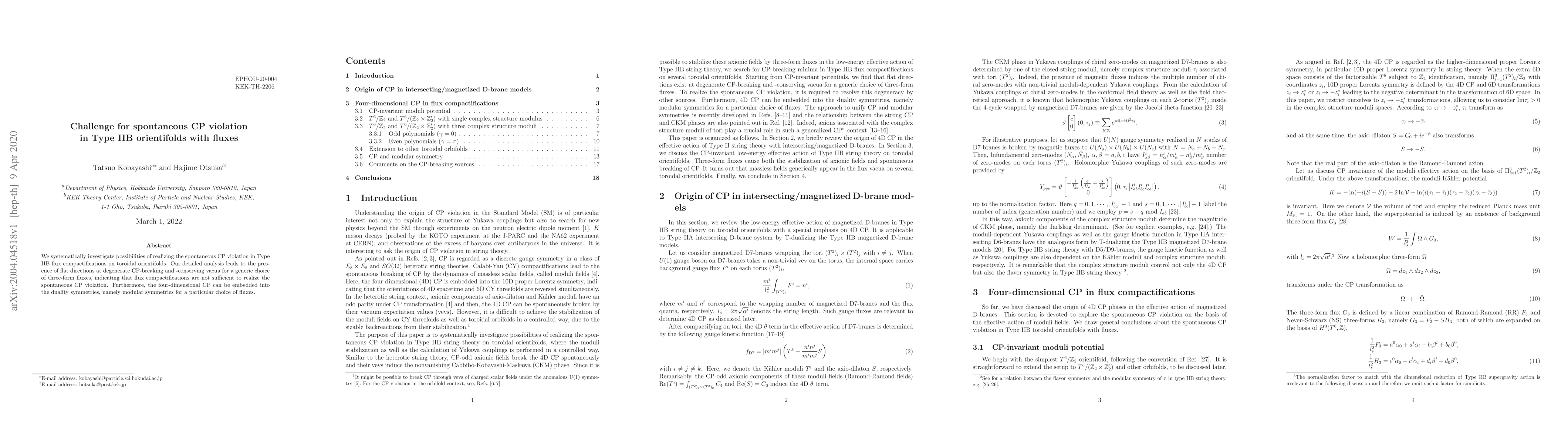 Summary: This research systematically explores spontaneous CP violation in Type IIB orientifolds with fluxes, revealing that standard flux compactifications cannot achieve it due to flat directions at degenerate vacua. It also finds that four-dimensional CP symmetry can be incorporated into duality symmetries, specifically modular symmetries, under specific flux configurations.