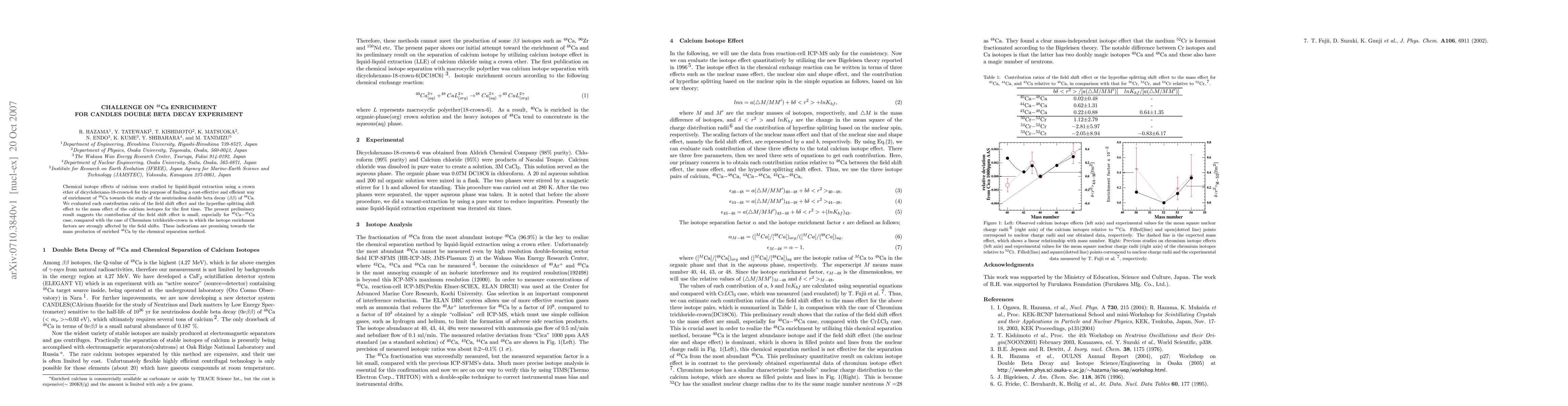 This study investigates the chemical isotope effects of calcium using liquid-liquid extraction with dicyclohexano-18-crown-6 to enrich Ca-48 for the CANDLES double beta decay experiment. Preliminary results suggest that the field shift effect contributes minimally to isotope enrichment, indicating potential for cost-effective chemical separation methods.