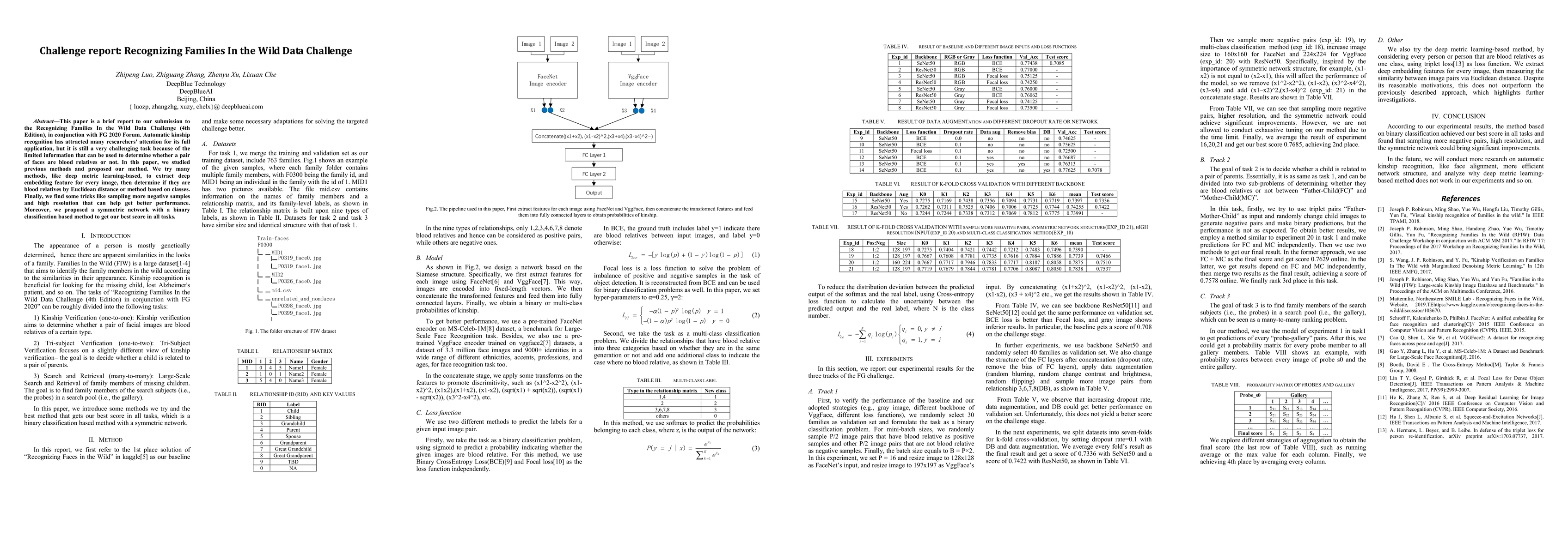 This paper is a brief report to our submission to the Recognizing Families In the Wild Data Challenge (4th Edition), in conjunction with FG 2020 Forum. Automatic kinship recognition has attracted many researchers' attention for its full application, but it is still a very challenging task because of the limited information that can be used to determine whether a pair of faces are blood relatives or not. In this paper, we studied previous methods and proposed our method. We try many methods, like deep metric learning-based, to extract deep embedding feature for every image, then determine if they are blood relatives by Euclidean distance or method based on classes. Finally, we find some tricks like sampling more negative samples and high resolution that can help get better performance. Moreover, we proposed a symmetric network with a binary classification based method to get our best score in all tasks.