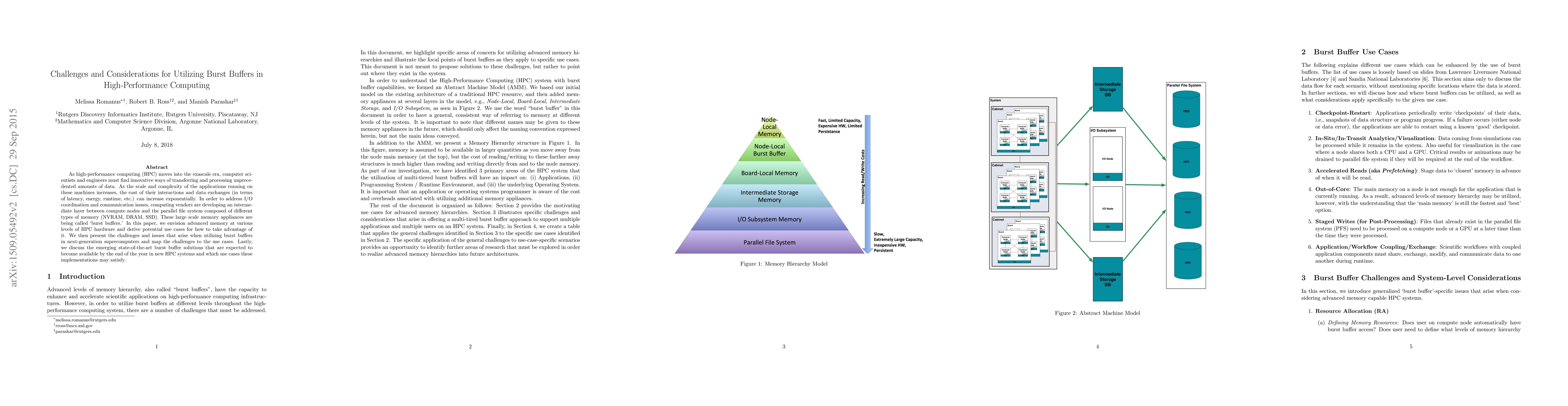 As high-performance computing (HPC) moves into the exascale era, computer scientists and engineers must find innovative ways of transferring and processing unprecedented amounts of data. As the scale and complexity of the applications running on these machines increases, the cost of their interactions and data exchanges (in terms of latency, energy, runtime, etc.) can increase exponentially. In order to address I/O coordination and communication issues, computing vendors are developing an intermediate layer between compute nodes and the parallel file system composed of different types of memory (NVRAM, DRAM, SSD). These large scale memory appliances are being called 'burst buffers.' In this paper, we envision advanced memory at various levels of HPC hardware and derive potential use cases for how to take advantage of it. We then present the challenges and issues that arise when utilizing burst buffers in next-generation supercomputers and map the challenges to the use cases. Lastly, we discuss the emerging state-of-the-art burst buffer solutions that are expected to become available by the end of the year in new HPC systems and which use cases these implementations may satisfy.