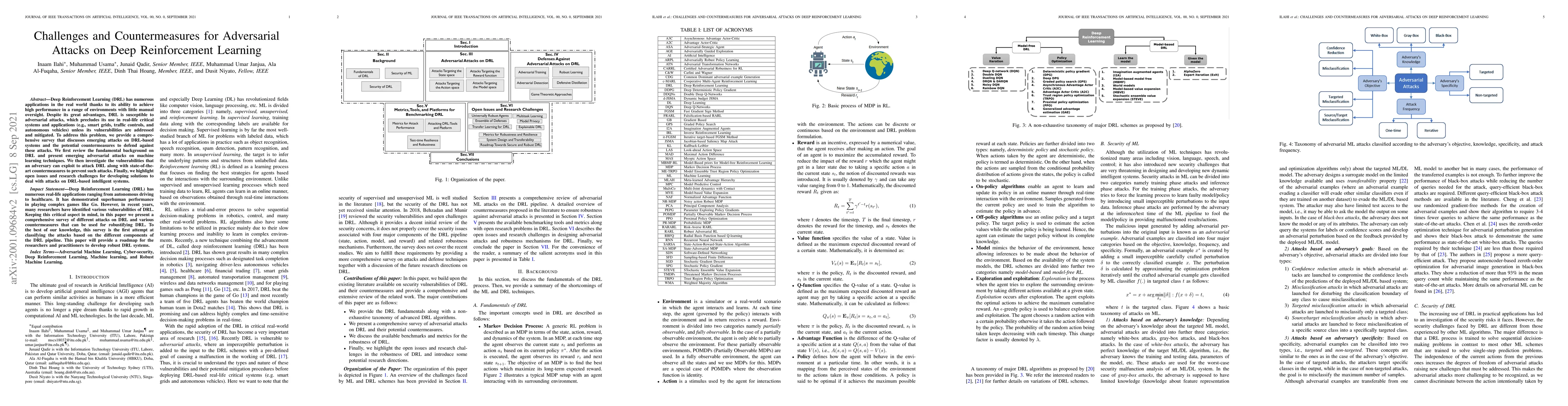 This paper surveys adversarial attacks on Deep Reinforcement Learning (DRL) and proposes countermeasures. It discusses vulnerabilities in DRL systems and presents state-of-the-art defensive strategies, while also identifying open issues and future research directions.