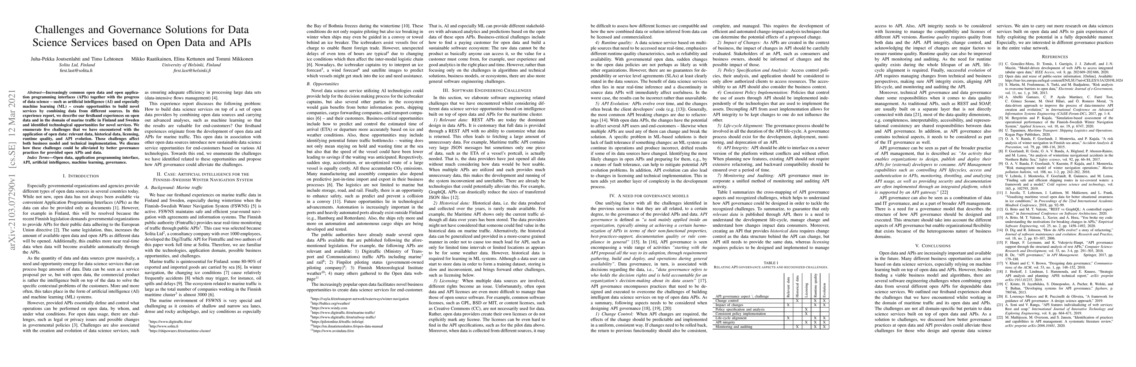 This paper discusses challenges in utilizing open data and APIs for data science services, particularly in marine traffic in Finland and Sweden. Identified challenges include data relevance, historical data availability, licensing issues, runtime quality, and API evolution. The paper proposes governance solutions to mitigate these issues and enhance service development.