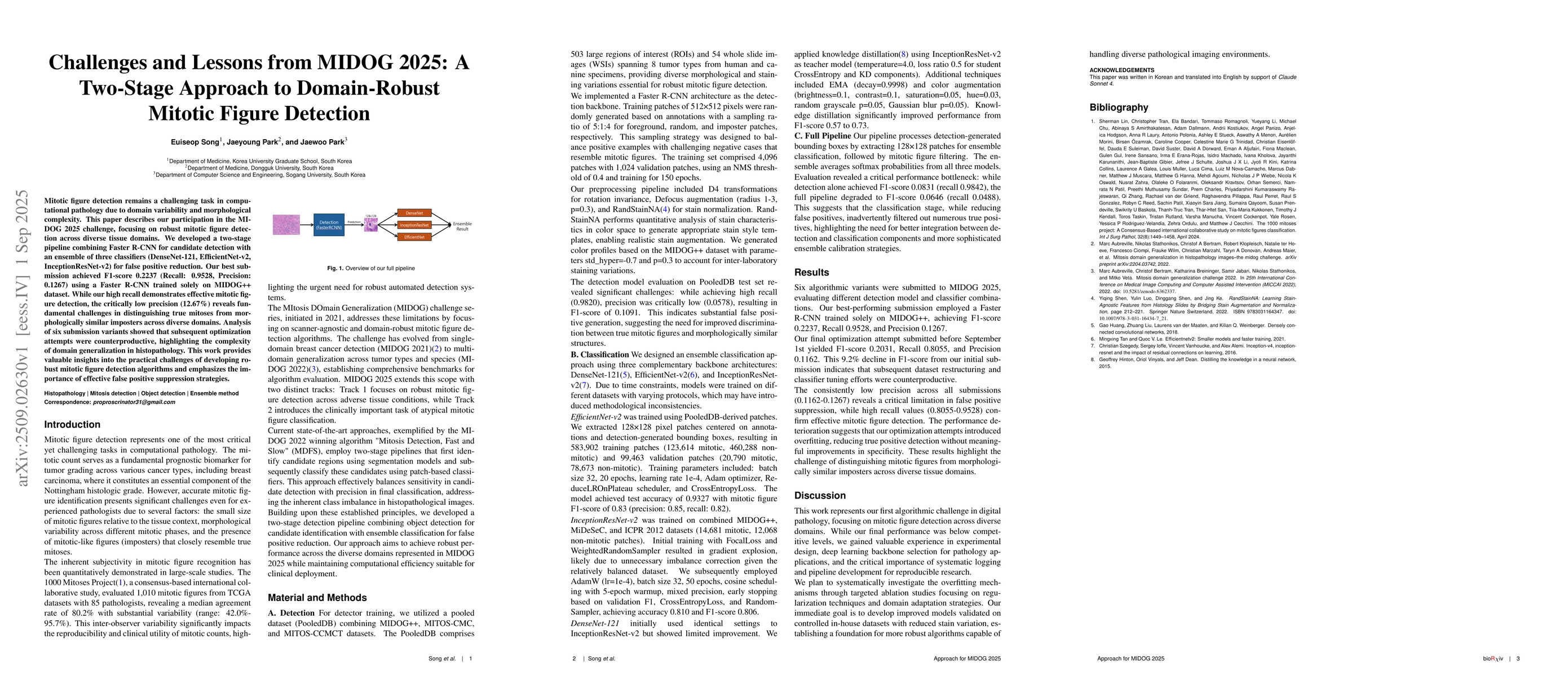 Mitotic figure detection remains a challenging task in computational pathology due to domain variability and morphological complexity. This paper describes our participation in the MIDOG 2025 challenge, focusing on robust mitotic figure detection across diverse tissue domains. We developed a two-stage pipeline combining Faster R-CNN for candidate detection with an ensemble of three classifiers (DenseNet-121, EfficientNet-v2, InceptionResNet-v2) for false positive reduction. Our best submission achieved F1-score 0.2237 (Recall: 0.9528, Precision: 0.1267) using a Faster R-CNN trained solely on MIDOG++ dataset. While our high recall demonstrates effective mitotic figure detection, the critically low precision (12.67%) reveals fundamental challenges in distinguishing true mitoses from morphologically similar imposters across diverse domains. Analysis of six submission variants showed that subsequent optimization attempts were counterproductive, highlighting the omplexity of domain generalization in histopathology. This work provides valuable insights into the practical challenges of developing robust mitotic figure detection algorithms and emphasizes the importance of effective false positive suppression strategies.