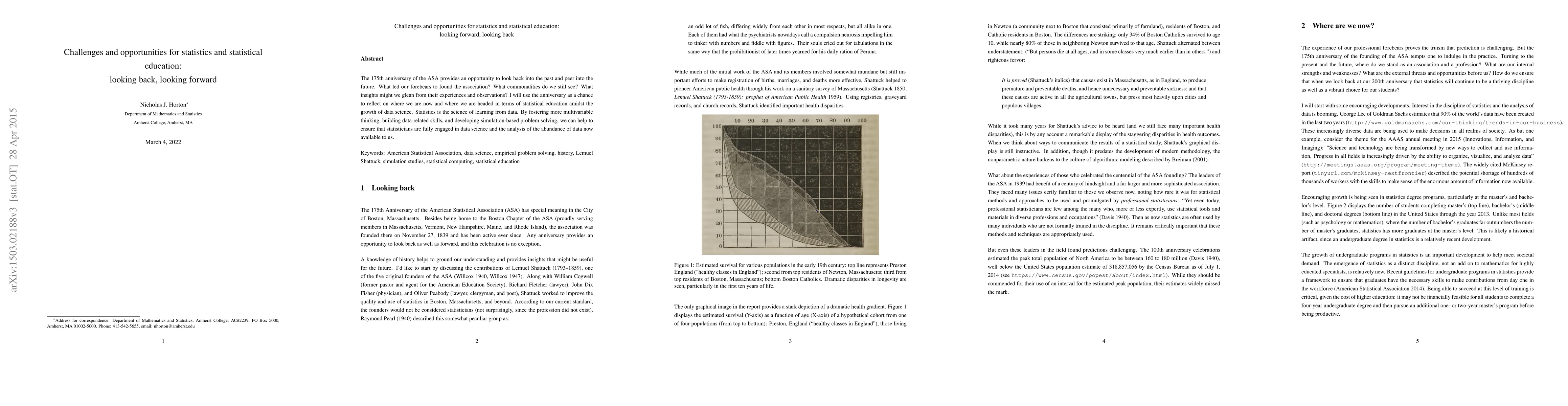 The 175th anniversary of the ASA provides an opportunity to look back into the past and peer into the future. What led our forebears to found the association? What commonalities do we still see? What insights might we glean from their experiences and observations? I will use the anniversary as a chance to reflect on where we are now and where we are headed in terms of statistical education amidst the growth of data science. Statistics is the science of learning from data. By fostering more multivariable thinking, building data-related skills, and developing simulation-based problem solving, we can help to ensure that statisticians are fully engaged in data science and the analysis of the abundance of data now available to us.