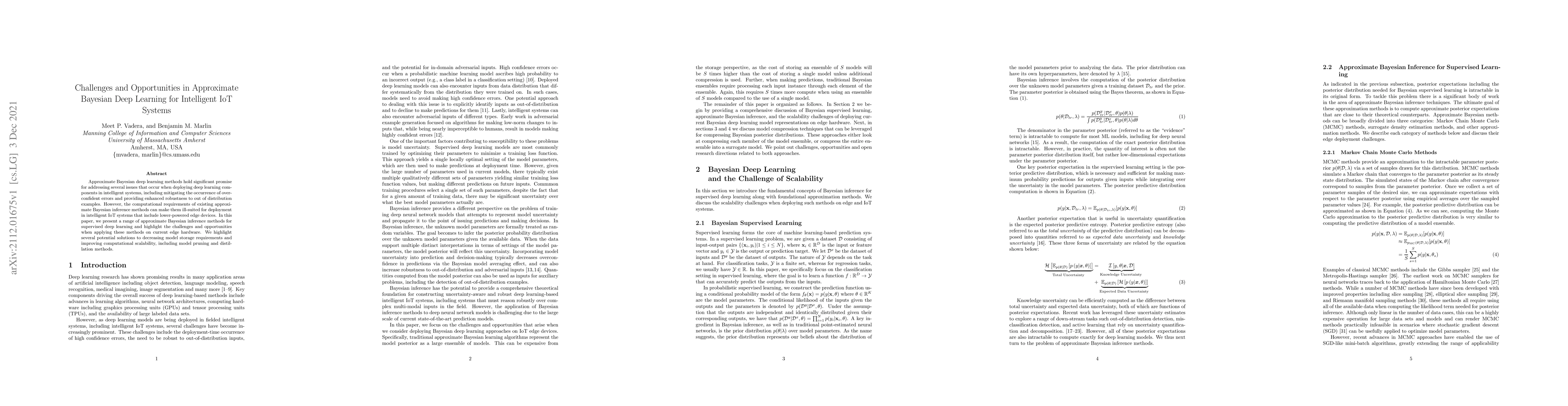 Approximate Bayesian deep learning methods hold significant promise for addressing several issues that occur when deploying deep learning components in intelligent systems, including mitigating the occurrence of over-confident errors and providing enhanced robustness to out of distribution examples. However, the computational requirements of existing approximate Bayesian inference methods can make them ill-suited for deployment in intelligent IoT systems that include lower-powered edge devices. In this paper, we present a range of approximate Bayesian inference methods for supervised deep learning and highlight the challenges and opportunities when applying these methods on current edge hardware. We highlight several potential solutions to decreasing model storage requirements and improving computational scalability, including model pruning and distillation methods.