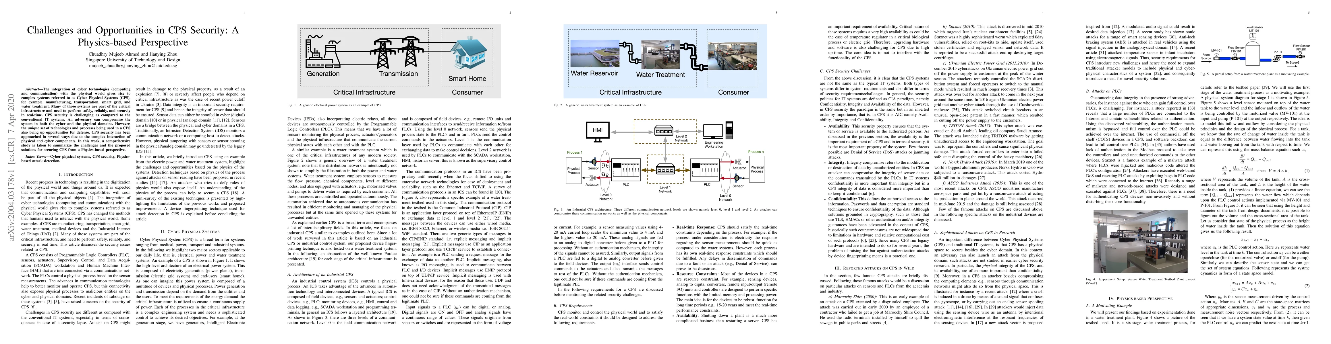 The integration of cyber technologies (computing and communication) with the physical world gives rise to complex systems referred to as Cyber Physical Systems (CPS), for example, manufacturing, transportation, smart grid, and water treatment. Many of those systems are part of the critical infrastructure and need to perform safely, reliably, and securely in real-time. CPS security is challenging as compared to the conventional IT systems. An adversary can compromise the system in both the cyber and the physical domains. However, the unique set of technologies and processes being used in a CPS also bring up opportunities for defense. CPS security has been approached in several ways due to the complex interaction of physical and cyber components. In this work, a comprehensive study is taken to summarize the challenges and the proposed solutions for securing CPS from a Physics-based perspective.