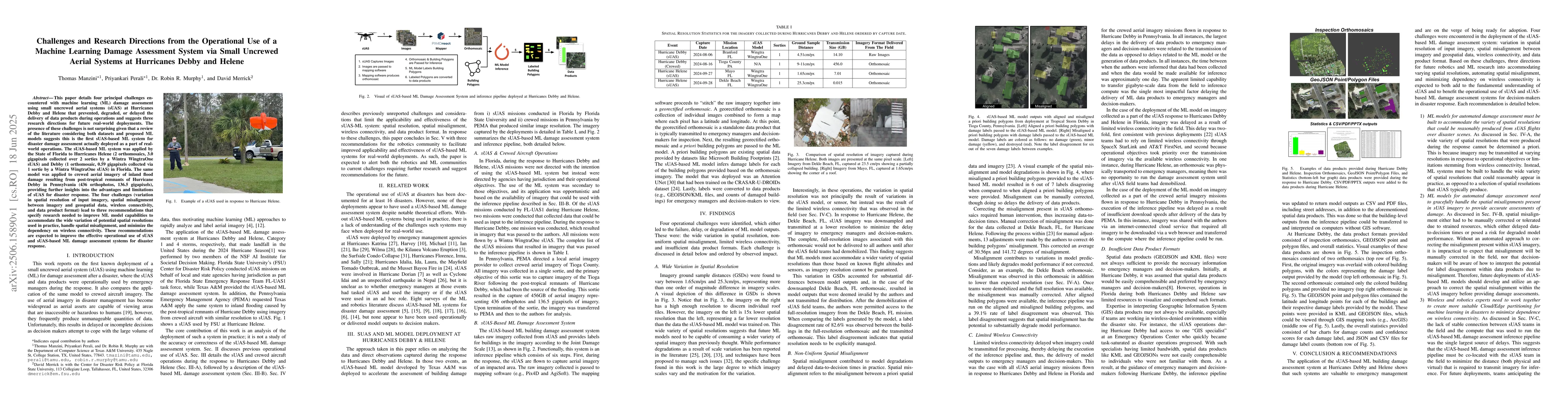 This paper details four principal challenges encountered with machine learning (ML) damage assessment using small uncrewed aerial systems (sUAS) at Hurricanes Debby and Helene that prevented, degraded, or delayed the delivery of data products during operations and suggests three research directions for future real-world deployments. The presence of these challenges is not surprising given that a review of the literature considering both datasets and proposed ML models suggests this is the first sUAS-based ML system for disaster damage assessment actually deployed as a part of real-world operations. The sUAS-based ML system was applied by the State of Florida to Hurricanes Helene (2 orthomosaics, 3.0 gigapixels collected over 2 sorties by a Wintra WingtraOne sUAS) and Debby (1 orthomosaic, 0.59 gigapixels collected via 1 sortie by a Wintra WingtraOne sUAS) in Florida. The same model was applied to crewed aerial imagery of inland flood damage resulting from post-tropical remnants of Hurricane Debby in Pennsylvania (436 orthophotos, 136.5 gigapixels), providing further insights into the advantages and limitations of sUAS for disaster response. The four challenges (variationin spatial resolution of input imagery, spatial misalignment between imagery and geospatial data, wireless connectivity, and data product format) lead to three recommendations that specify research needed to improve ML model capabilities to accommodate the wide variation of potential spatial resolutions used in practice, handle spatial misalignment, and minimize the dependency on wireless connectivity. These recommendations are expected to improve the effective operational use of sUAS and sUAS-based ML damage assessment systems for disaster response.