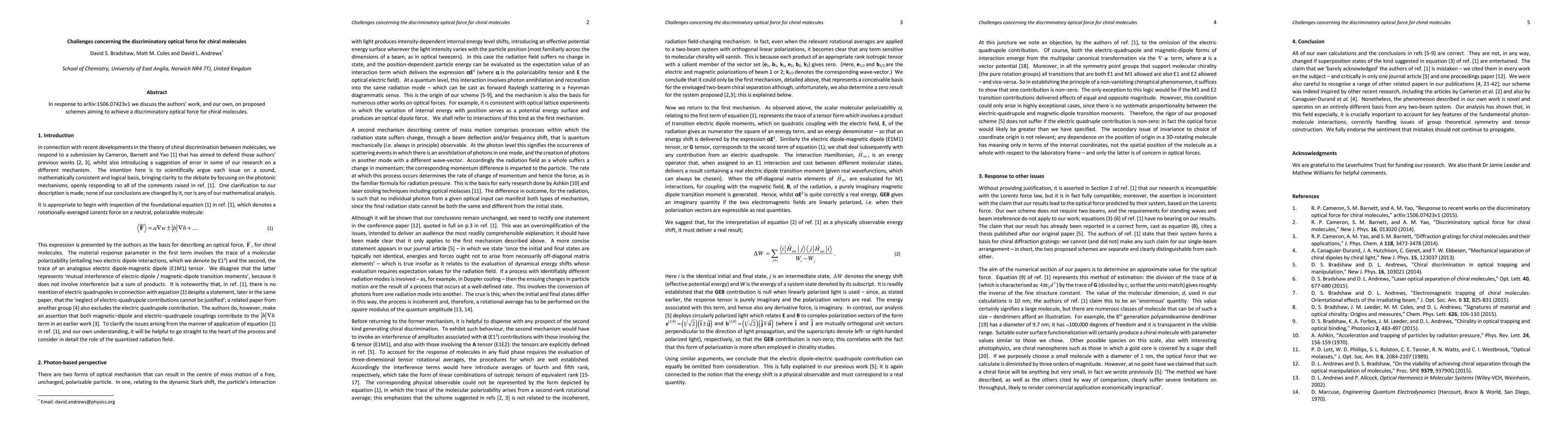 In response to arXiv:1506.07423v1 we discuss the authors work, and our own, on proposed schemes aiming to achieve a discriminatory optical force for chiral molecules.