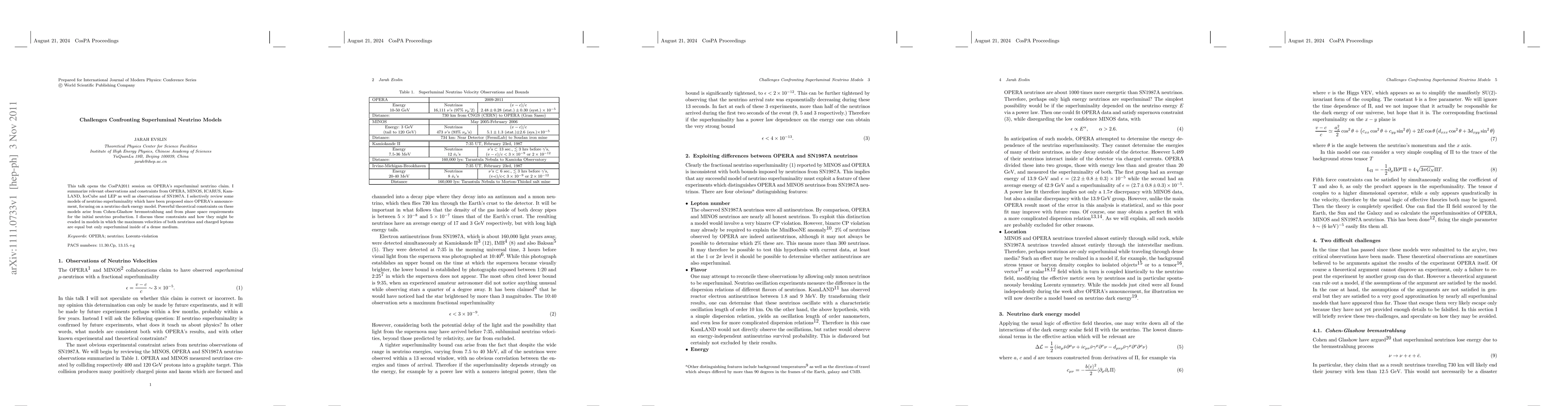 This talk opens the CosPA2011 session on OPERA's superluminal neutrino claim. I summarize relevant observations and constraints from OPERA, MINOS, ICARUS, KamLAND, IceCube and LEP as well as observations of SN1987A. I selectively review some models of neutrino superluminality which have been proposed since OPERA's announcement, focusing on a neutrino dark energy model. Powerful theoretical constraints on these models arise from Cohen-Glashow bremsstrahlung and from phase space requirements for the initial neutrino production. I discuss these constraints and how they might be evaded in models in which the maximum velocities of both neutrinos and charged leptons are equal but only superluminal inside of a dense medium.