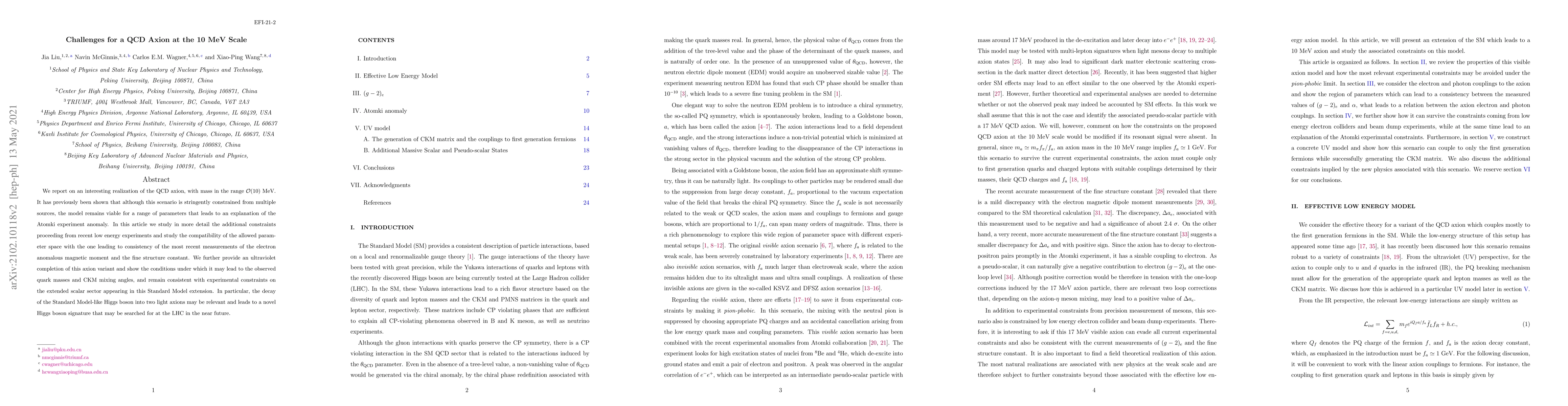 We report on an interesting realization of the QCD axion, with mass in the range $\mathcal{O}(10)$ MeV. It has previously been shown that although this scenario is stringently constrained from multiple sources, the model remains viable for a range of parameters that leads to an explanation of the Atomki experiment anomaly. In this article we study in more detail the additional constraints proceeding from recent low energy experiments and study the compatibility of the allowed parameter space with the one leading to consistency of the most recent measurements of the electron anomalous magnetic moment and the fine structure constant. We further provide an ultraviolet completion of this axion variant and show the conditions under which it may lead to the observed quark masses and CKM mixing angles, and remain consistent with experimental constraints on the extended scalar sector appearing in this Standard Model extension. In particular, the decay of the Standard Model-like Higgs boson into two light axions may be relevant and leads to a novel Higgs boson signature that may be searched for at the LHC in the near future.