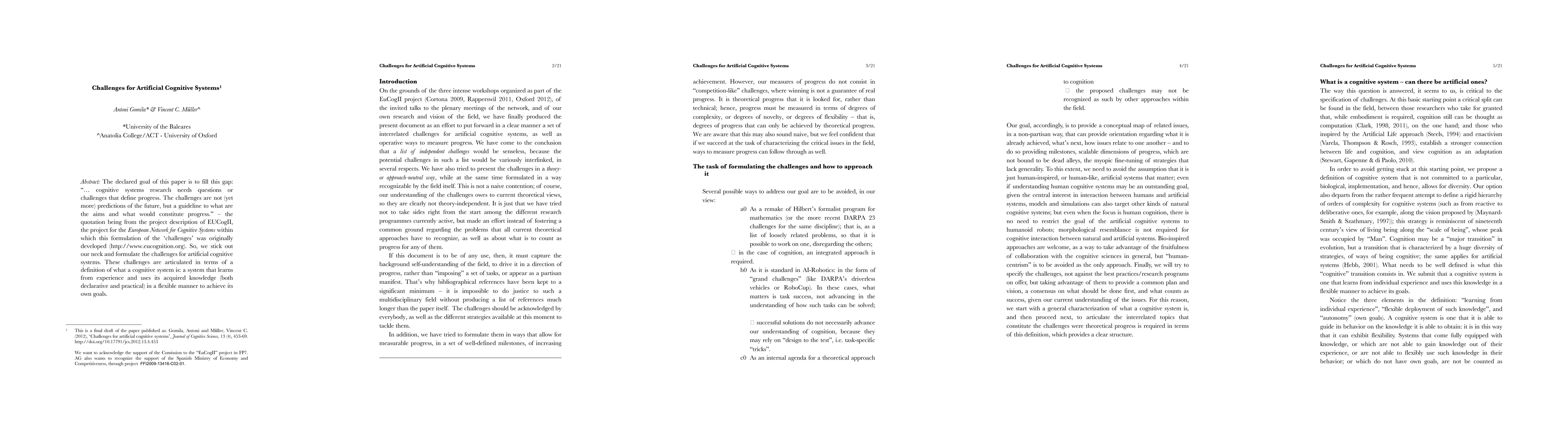 The declared goal of this paper is to fill this gap: "... cognitive systems research needs questions or challenges that define progress. The challenges are not (yet more) predictions of the future, but a guideline to what are the aims and what would constitute progress." -- the quotation being from the project description of EUCogII, the project for the European Network for Cognitive Systems within which this formulation of the 'challenges' was originally developed (http://www.eucognition.org). So, we stick out our neck and formulate the challenges for artificial cognitive systems. These challenges are articulated in terms of a definition of what a cognitive system is: a system that learns from experience and uses its acquired knowledge (both declarative and practical) in a flexible manner to achieve its own goals.