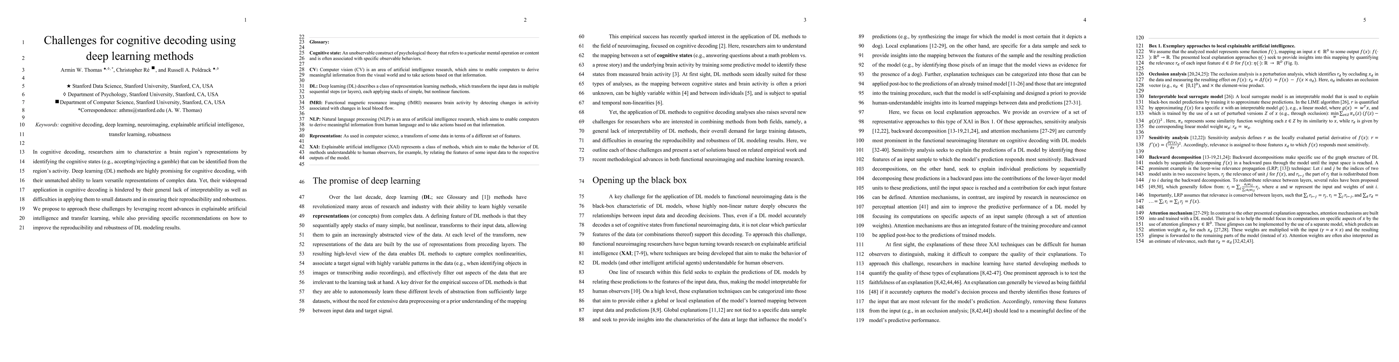 This paper discusses the challenges of applying deep learning methods to cognitive decoding, emphasizing the lack of interpretability, difficulties with small datasets, and issues with reproducibility and robustness. It proposes leveraging explainable AI and transfer learning to address these issues and offers recommendations to enhance the reliability of deep learning models in cognitive decoding.