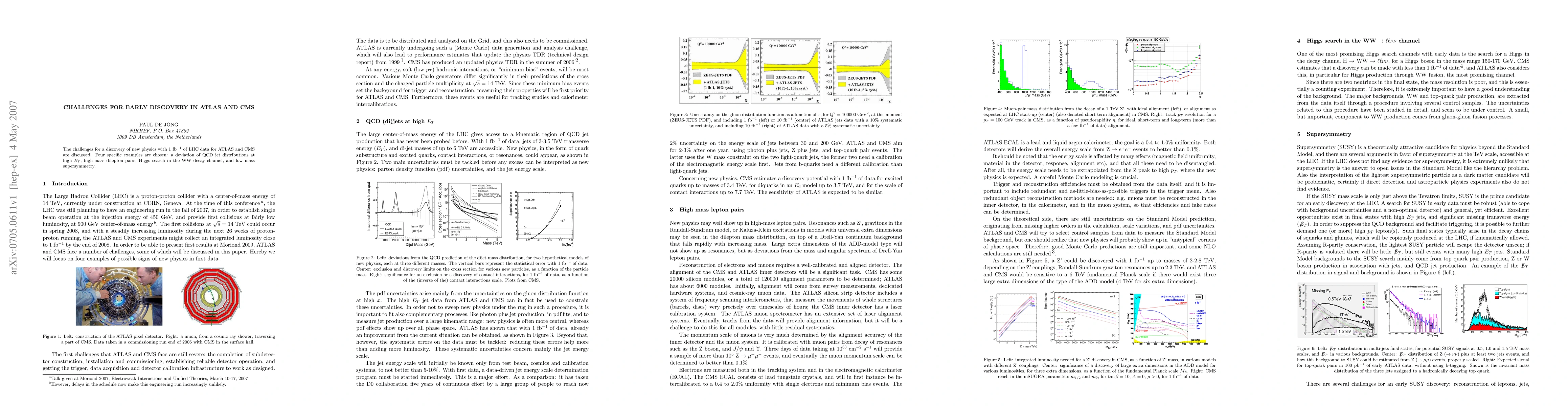 The paper discusses the challenges faced by ATLAS and CMS in discovering new physics using 1 fb^-1 of LHC data, focusing on four specific examples: deviations in QCD jet distributions, high-mass dilepton pairs, Higgs search in the WW decay channel, and low mass supersymmetry. These examples highlight the complexities involved in early data analysis and interpretation.