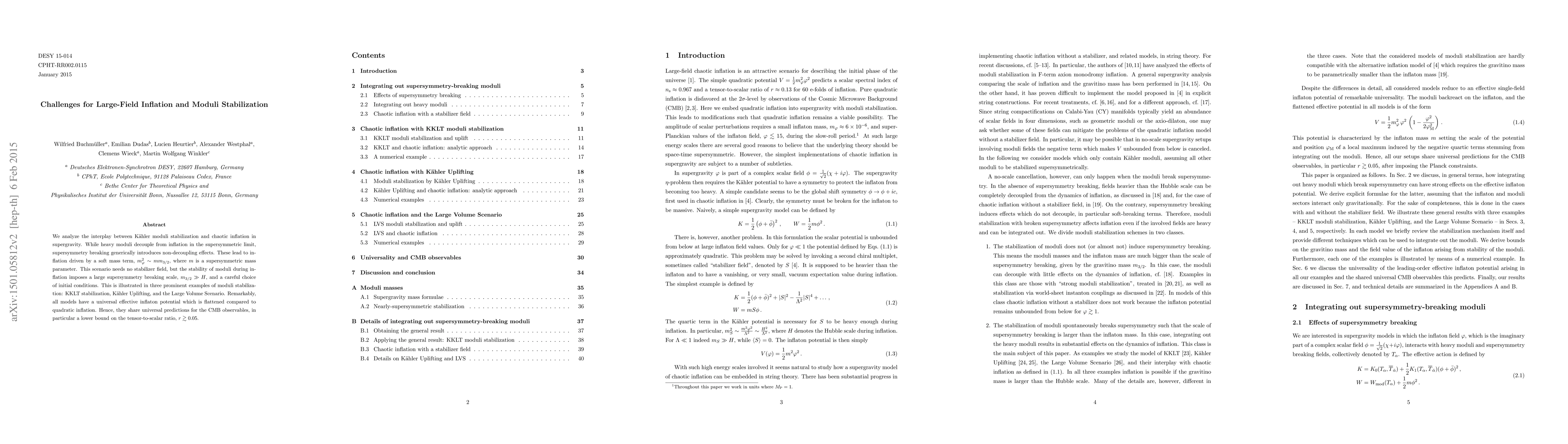 We analyze the interplay between K\"ahler moduli stabilization and chaotic inflation in supergravity. While heavy moduli decouple from inflation in the supersymmetric limit, supersymmetry breaking generically introduces non-decoupling effects. These lead to inflation driven by a soft mass term, $m_\varphi^2 \sim m m_{3/2}$, where $m$ is a supersymmetric mass parameter. This scenario needs no stabilizer field, but the stability of moduli during inflation imposes a large supersymmetry breaking scale, $m_{3/2} \gg H$, and a careful choice of initial conditions. This is illustrated in three prominent examples of moduli stabilization: KKLT stabilization, K\"ahler Uplifting, and the Large Volume Scenario. Remarkably, all models have a universal effective inflaton potential which is flattened compared to quadratic inflation. Hence, they share universal predictions for the CMB observables, in particular a lower bound on the tensor-to-scalar ratio, $r \gtrsim 0.05$.