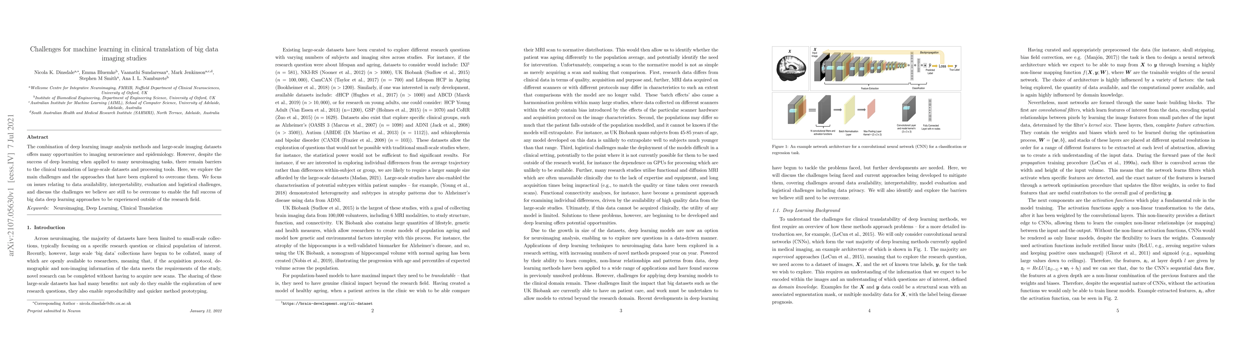 The combination of deep learning image analysis methods and large-scale imaging datasets offers many opportunities to imaging neuroscience and epidemiology. However, despite the success of deep learning when applied to many neuroimaging tasks, there remain barriers to the clinical translation of large-scale datasets and processing tools. Here, we explore the main challenges and the approaches that have been explored to overcome them. We focus on issues relating to data availability, interpretability, evaluation and logistical challenges, and discuss the challenges we believe are still to be overcome to enable the full success of big data deep learning approaches to be experienced outside of the research field.