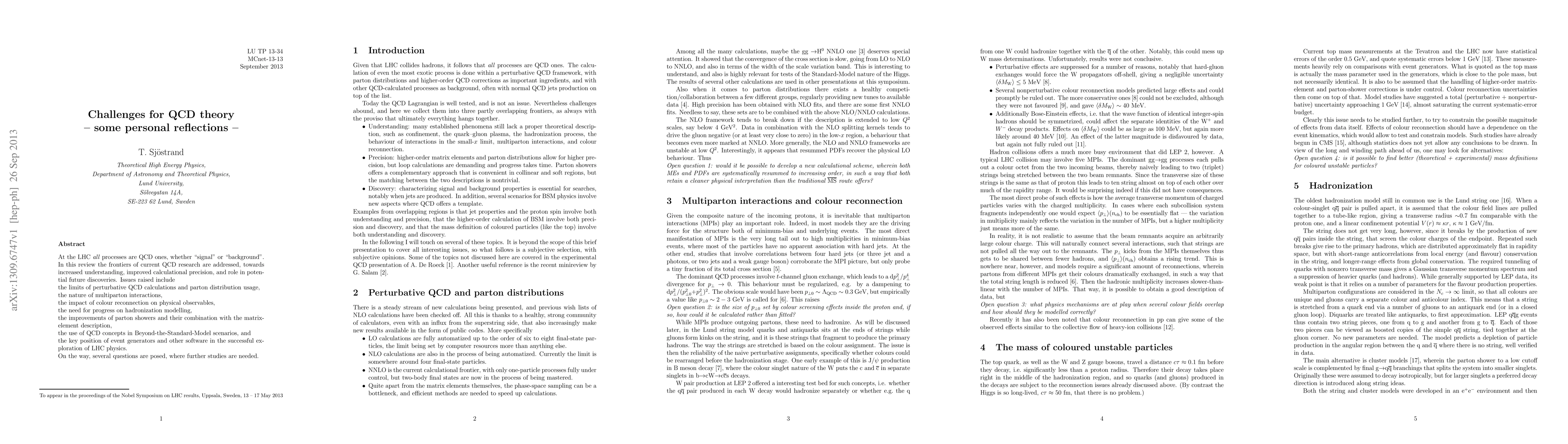 This review explores challenges in Quantum Chromodynamics (QCD) theory, including perturbative calculations, multiparton interactions, and hadronization modelling, to improve our understanding of high-energy physics discoveries at the LHC.
