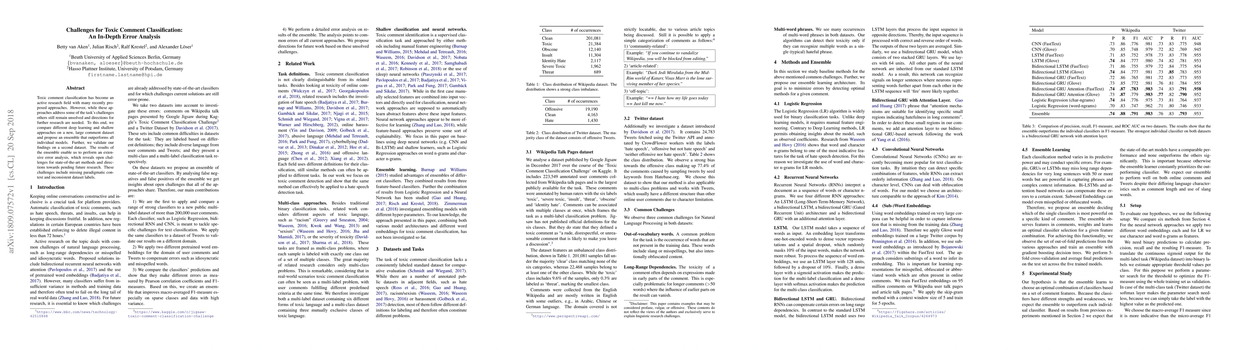 Researchers analyzed challenges in toxic comment classification using deep learning and shallow approaches, proposing an ensemble method that outperforms individual models and identifies areas for future research.