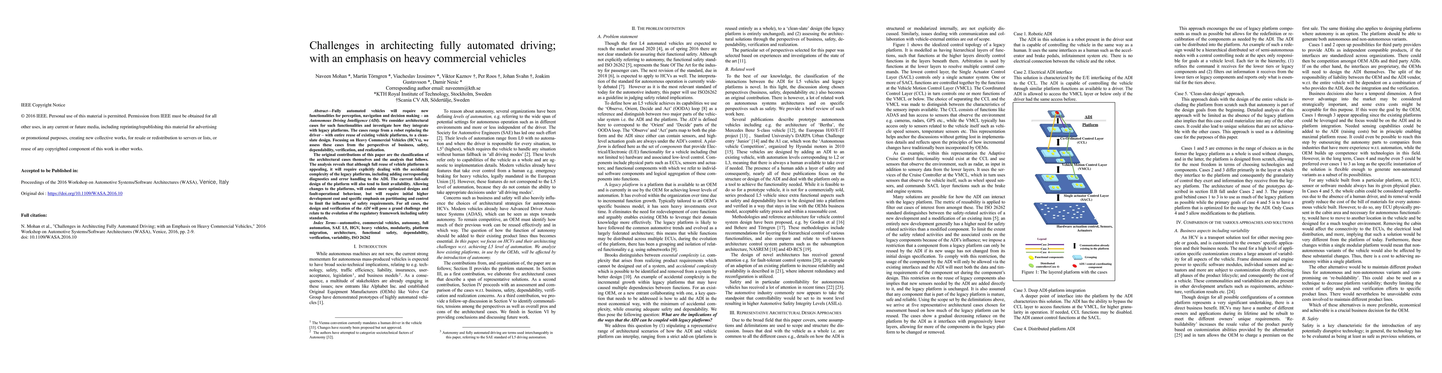 Fully automated vehicles will require new functionalities for perception, navigation and decision making -- an Autonomous Driving Intelligence (ADI). We consider architectural cases for such functionalities and investigate how they integrate with legacy platforms. The cases range from a robot replacing the driver -- with entire reuse of existing vehicle platforms, to a clean-slate design. Focusing on Heavy Commercial Vehicles (HCVs), we assess these cases from the perspectives of business, safety, dependability, verification, and realization. The original contributions of this paper are the classification of the architectural cases themselves and the analysis that follows. The analysis reveals that although full reuse of vehicle platforms is appealing, it will require explicitly dealing with the accidental complexity of the legacy platforms, including adding corresponding diagnostics and error handling to the ADI. The current fail-safe design of the platform will also tend to limit availability. Allowing changes to the platforms, will enable more optimized designs and fault-operational behaviour, but will require initial higher development cost and specific emphasis on partitioning and control to limit the influences of safety requirements. For all cases, the design and verification of the ADI will pose a grand challenge and relate to the evolution of the regulatory framework including safety standards.