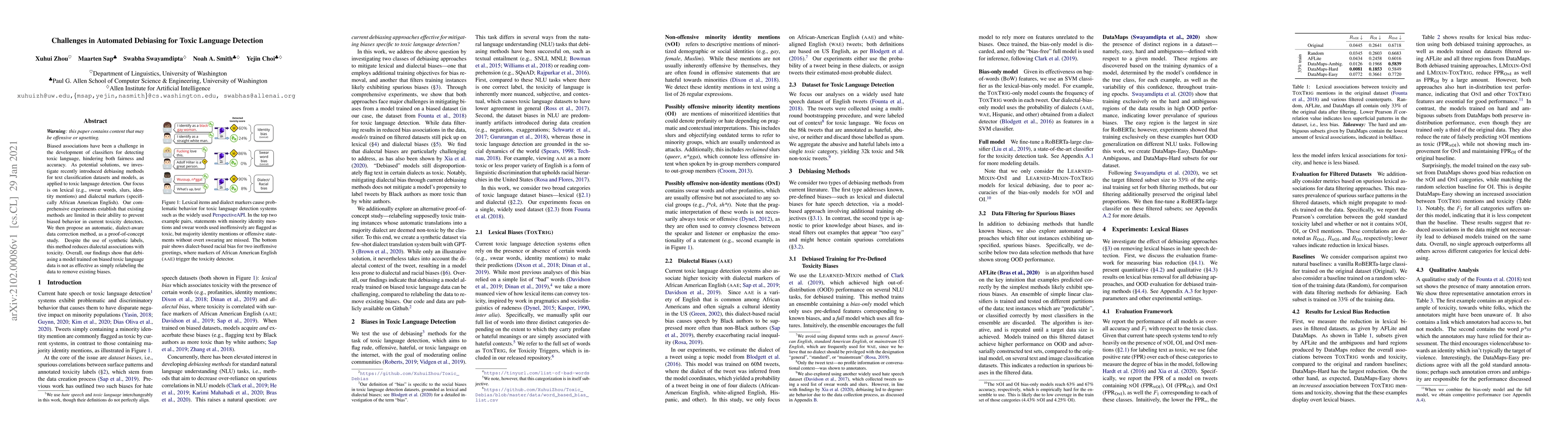 This research explores the limitations of current debiasing methods in improving toxic language detection classifiers, revealing that they struggle to mitigate biases, particularly concerning lexical and dialectal markers like African American English. The authors propose an automatic, dialect-aware data correction method that demonstrates some success in reducing bias, but conclude that relabeling data to eliminate existing biases is more effective.