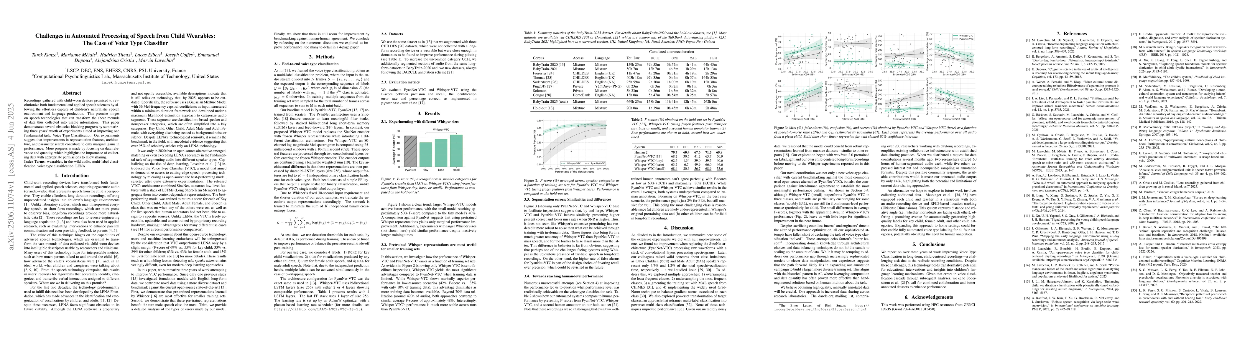 The paper details experiments over three years focusing on Voice Type Classification (VTC) from child wearable recordings. They compare PyanNet-VTC (based on SincNet) with Whisper-VTC (using frozen Whisper representations), exploring various model sizes and architectures. Datasets are augmented with CHILDES datasets and evaluated using F-score, identification error rate, and percentage correct.