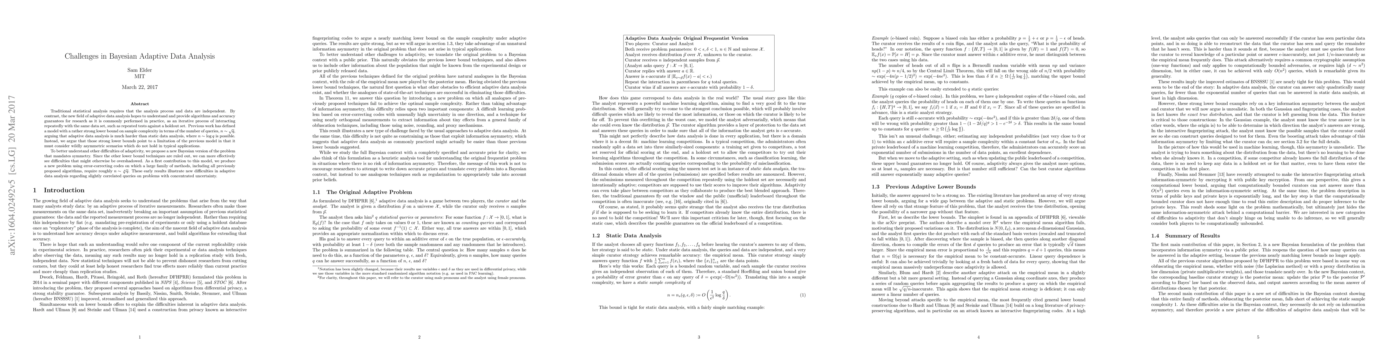 Traditional statistical analysis requires that the analysis process and data are independent. By contrast, the new field of adaptive data analysis hopes to understand and provide algorithms and accuracy guarantees for research as it is commonly performed in practice, as an iterative process of interacting repeatedly with the same data set, such as repeated tests against a holdout set. Previous work has defined a model with a rather strong lower bound on sample complexity in terms of the number of queries, $n\sim\sqrt q$, arguing that adaptive data analysis is much harder than static data analysis, where $n\sim\log q$ is possible. Instead, we argue that those strong lower bounds point to a limitation of the previous model in that it must consider wildly asymmetric scenarios which do not hold in typical applications. To better understand other difficulties of adaptivity, we propose a new Bayesian version of the problem that mandates symmetry. Since the other lower bound techniques are ruled out, we can more effectively see difficulties that might otherwise be overshadowed. As a first contribution to this model, we produce a new problem using error-correcting codes on which a large family of methods, including all previously proposed algorithms, require roughly $n\sim\sqrt[4]q$. These early results illustrate new difficulties in adaptive data analysis regarding slightly correlated queries on problems with concentrated uncertainty.