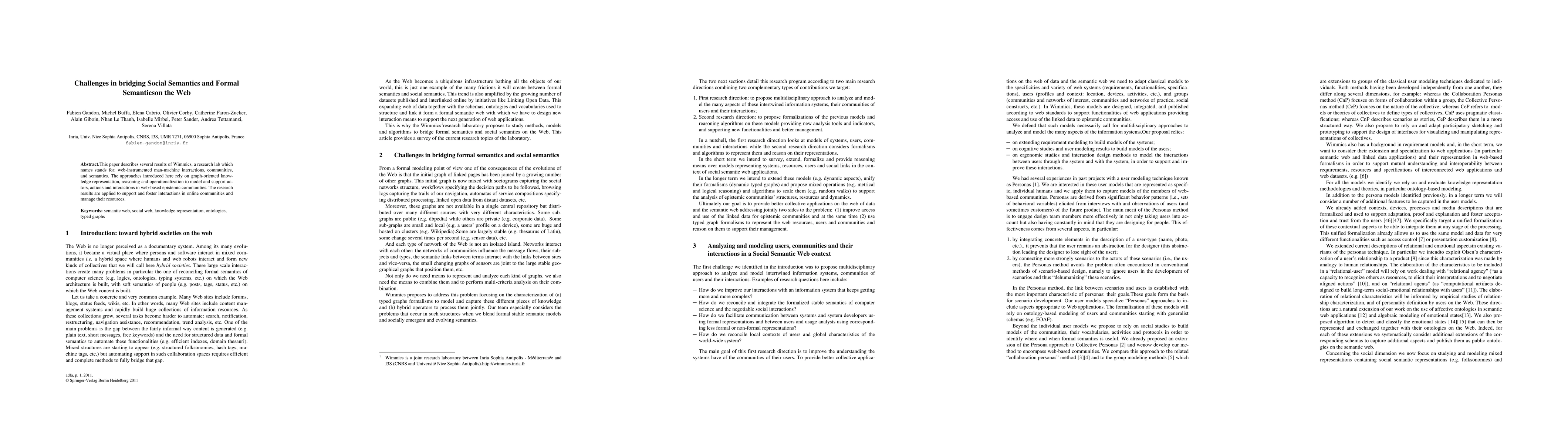 This paper describes several results of Wimmics, a research lab which names stands for: web-instrumented man-machine interactions, communities, and semantics. The approaches introduced here rely on graph-oriented knowledge representation, reasoning and operationalization to model and support actors, actions and interactions in web-based epistemic communities. The re-search results are applied to support and foster interactions in online communities and manage their resources.