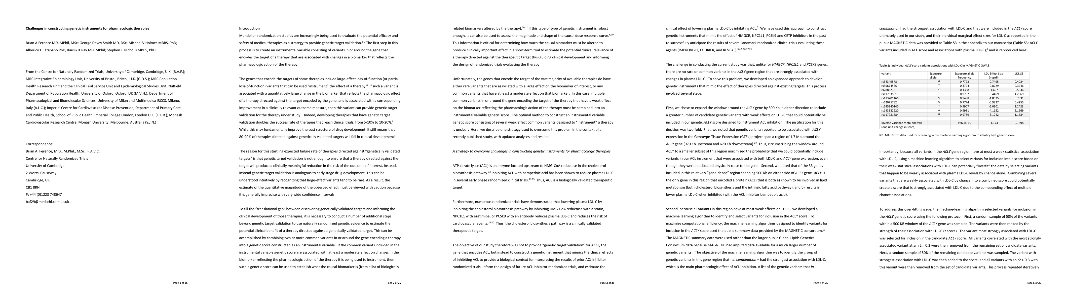 The genes that encode the targets of most therapies do not have rare variants with large-effect or common variants with moderate effects on the biomarker reflecting the pharmacologic action of the corresponding therapy. Therefore, providing genetic target validation for most therapies is challenging. Novel methods are being developed to combine multiple variants in the gene encoding the target of a therapy that are weakly associated with the biomarker reflecting the pharmacologic action of that therapy into a genetic score that can be used as an adequate instrumental variable. We describe one approach to solve this important problem.