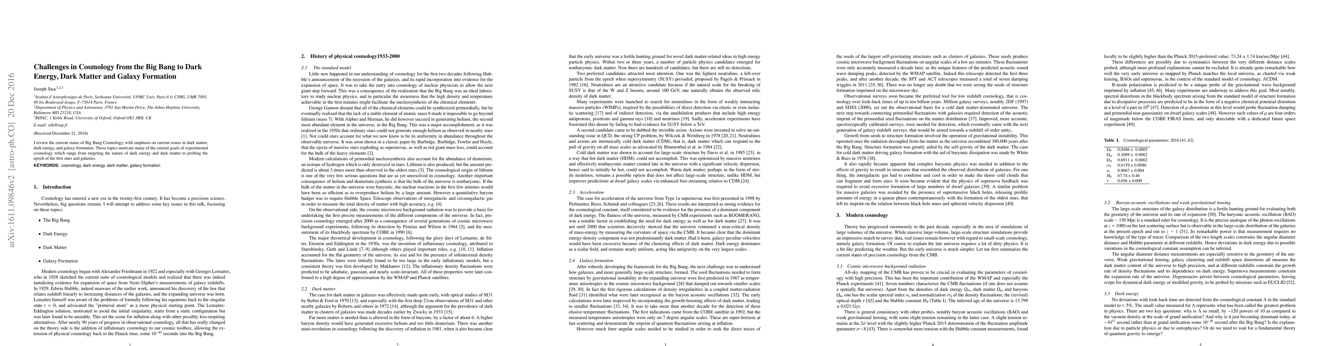 This paper reviews the current state of Big Bang Cosmology, focusing on unresolved issues regarding dark matter, dark energy, and galaxy formation, and outlines the experimental goals aimed at understanding these phenomena.