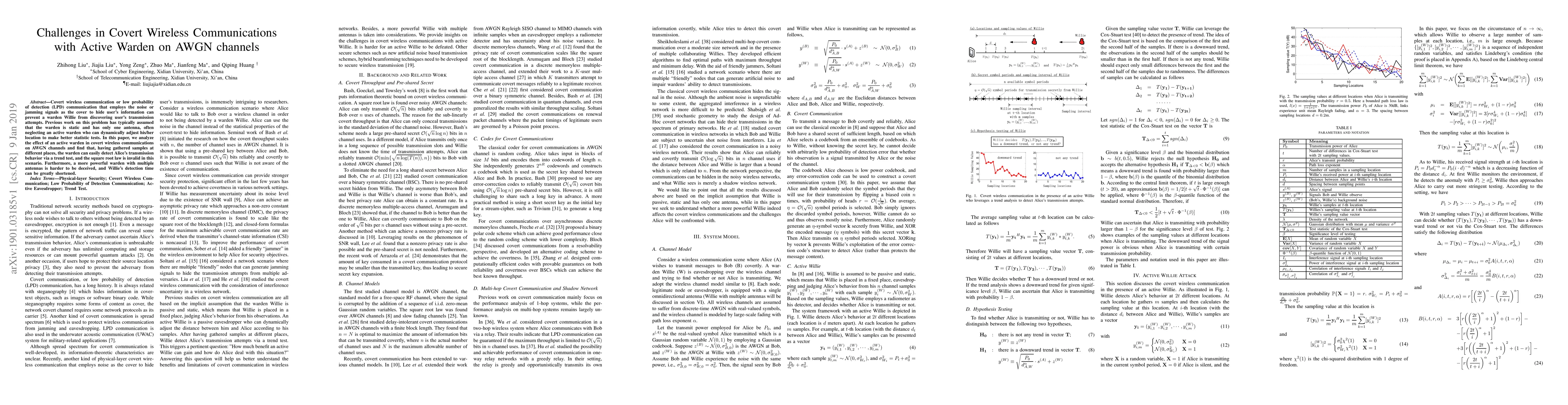 This paper explores the challenges of covert wireless communication in the presence of an active warden on AWGN channels, revealing that an active warden can detect transmissions more effectively by using trend tests and multiple antennas, invalidating the square root law and shortening detection time.