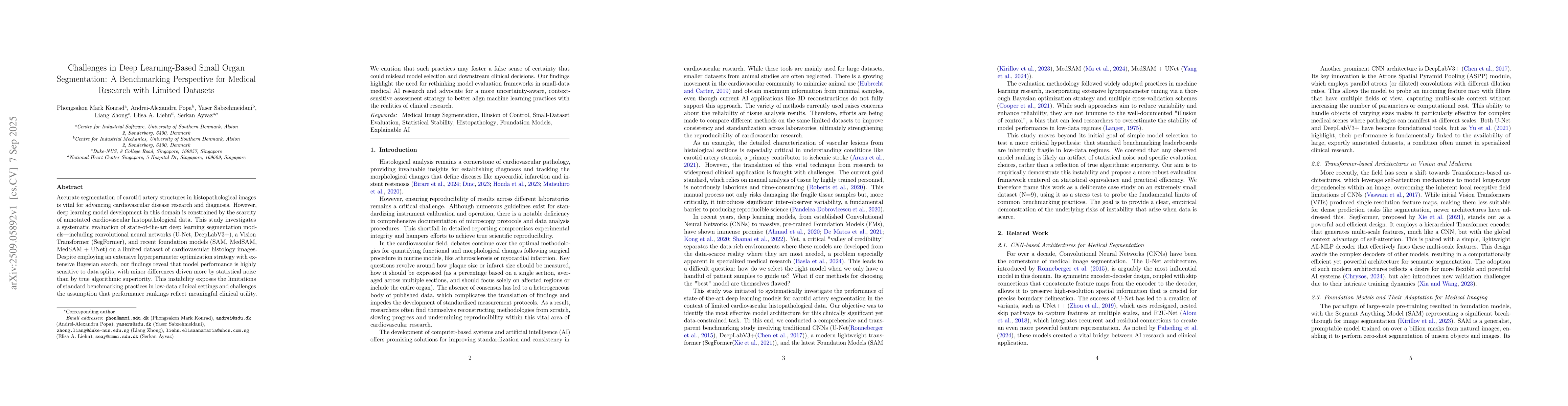 Accurate segmentation of carotid artery structures in histopathological images is vital for advancing cardiovascular disease research and diagnosis. However, deep learning model development in this domain is constrained by the scarcity of annotated cardiovascular histopathological data. This study investigates a systematic evaluation of state-of-the-art deep learning segmentation models, including convolutional neural networks (U-Net, DeepLabV3+), a Vision Transformer (SegFormer), and recent foundation models (SAM, MedSAM, MedSAM+UNet), on a limited dataset of cardiovascular histology images. Despite employing an extensive hyperparameter optimization strategy with Bayesian search, our findings reveal that model performance is highly sensitive to data splits, with minor differences driven more by statistical noise than by true algorithmic superiority. This instability exposes the limitations of standard benchmarking practices in low-data clinical settings and challenges the assumption that performance rankings reflect meaningful clinical utility.